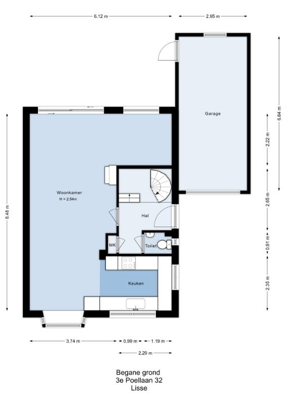 Garage: De aangebouwde garage is 2,95 meter diep en 6,64 meter breed. Tevens bereikbaar via een deur vanuit de achtertuin.