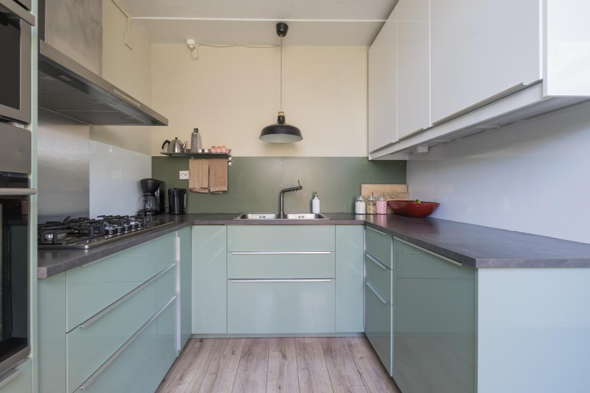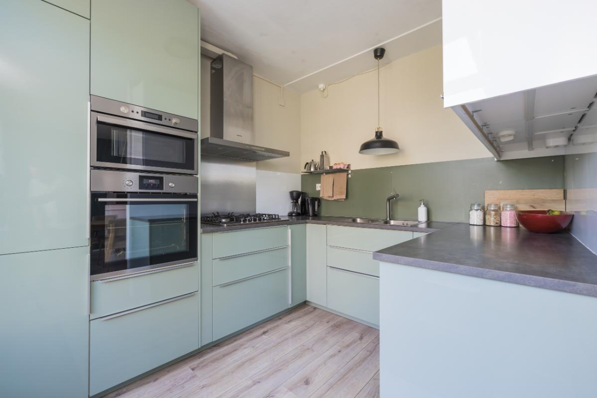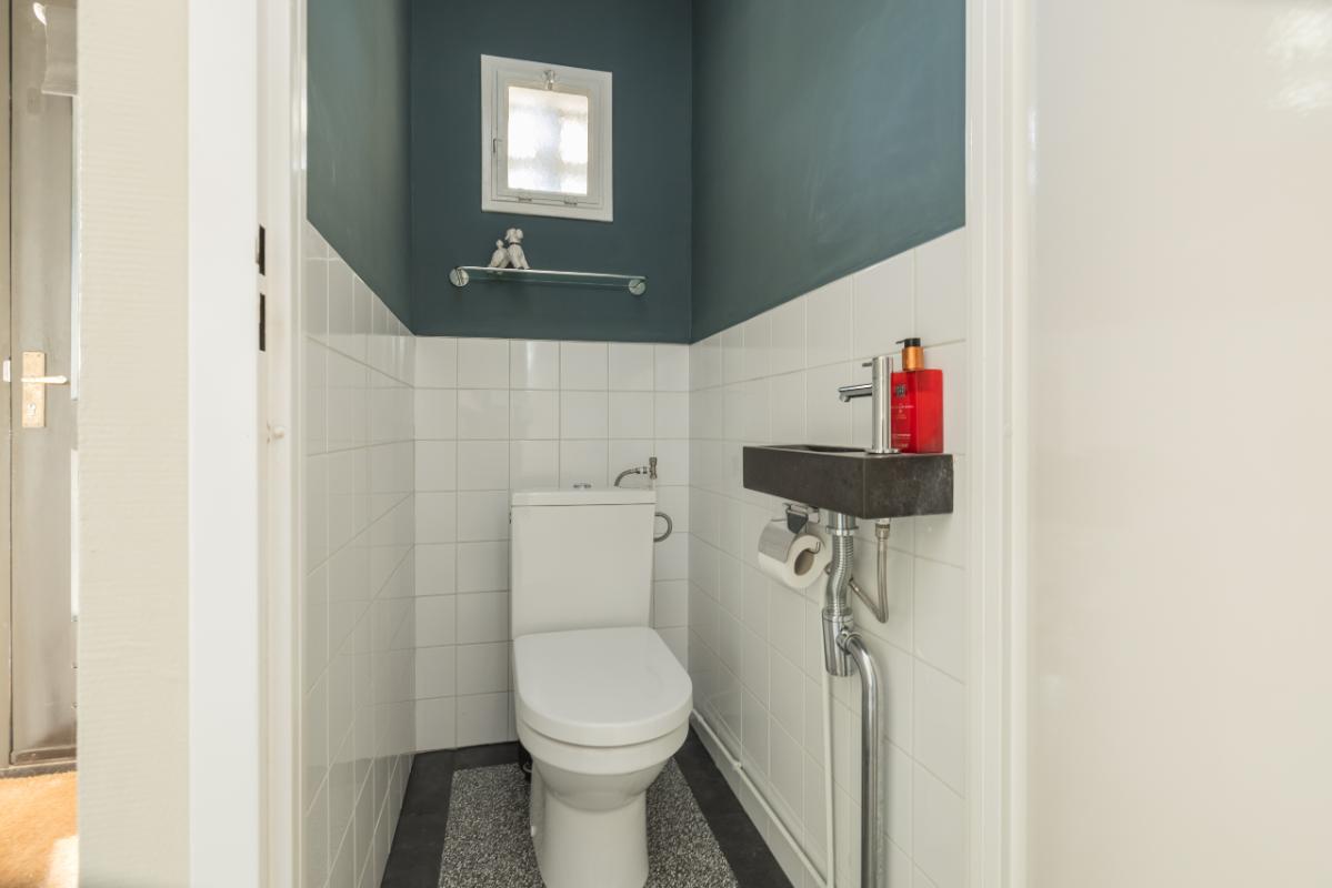 Layout – Ground Floor: Entrance, bright hallway with meter cupboard, convenient stair cupboard, and toilet with white wall tiles and a small sink. The spacious Z-shaped living room is wonderfully bright and playfully arranged, with the sitting area at the front and the dining area at the garden side. Adjacent is the modern, semi-open U-shaped kitchen in a fresh color scheme with a dark countertop, double sink, close-in boiler, ample cupboard space, and complete built-in appliances, including a 5-burner gas hob, oven, combination microwave, and dishwasher. The ground floor is finished with an attractive whitewashed laminate floor.