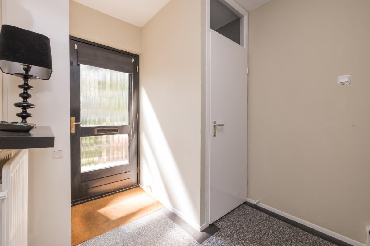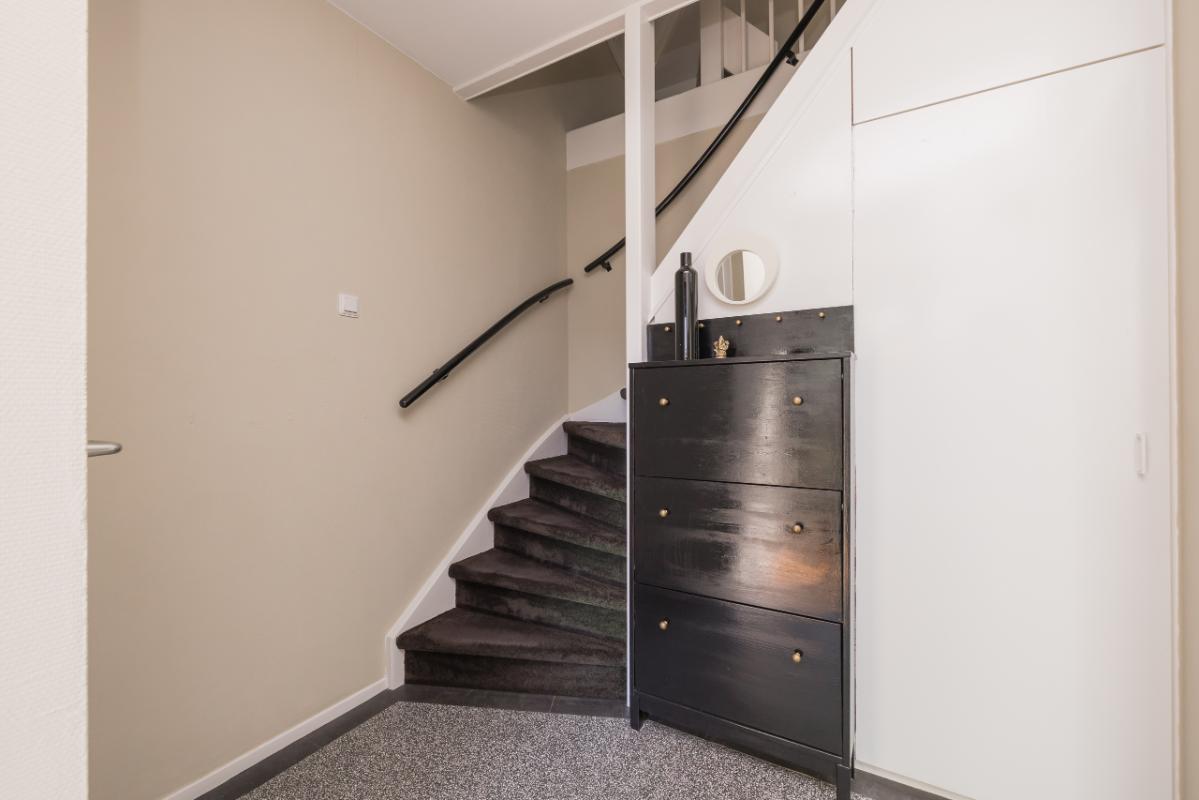 Indeling begane grond: Entree, lichte hal met meterkast, handige trapkast en toiletruimte met witte wandtegels en fonteintje. De royale Z-vormige woonkamer is heerlijk licht en speels ingedeeld met het zitgedeelte aan de voorzijde en eetgedeelte aan de tuinzijde. Aansluitend de moderne, halfopen U-keuken in frisse kleurstelling met donker werkblad, dubbele spoelbak, close-in boiler, veel kastruimte en complete inbouwapparatuur, waaronder een 5-pits gaskookplaat, oven, combimagnetron en vaatwasser. De begane grond is afgewerkt met een fraaie whitewash laminaatvloer.