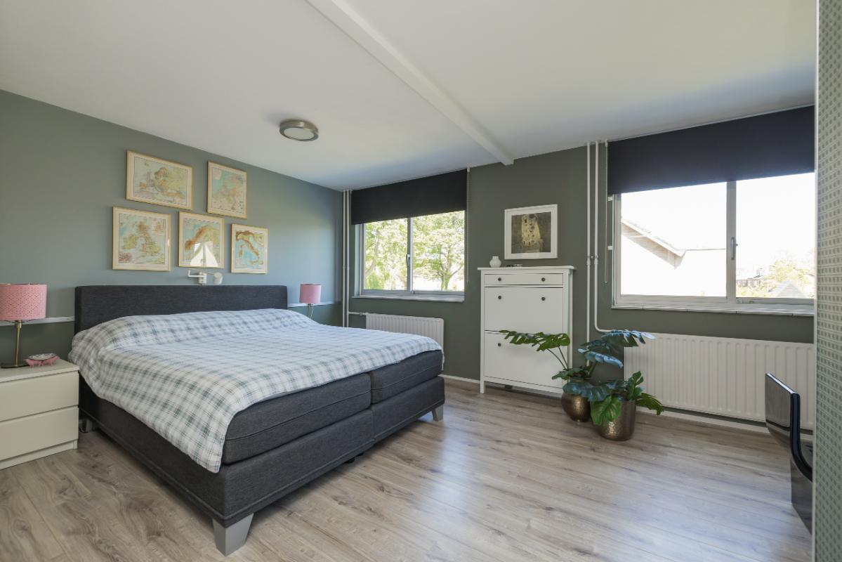 1e Etage: De ruime overloop geeft toegang tot 2 zeer royale slaapkamers, beide over de volle breedte van de woning. De slaapkamer aan de voorzijde is voorzien van een schuifdeur kastenwand en rolluiken; de kamer aan de achterzijde, eveneens met vaste kast, is ontstaan uit 2 kamers en eenvoudig weer te splitsen. De badkamer ligt centraal en is uitgevoerd in lichte kleuren, met ligbad/douche, zwevend toilet en wastafel. Op de vloer in de kamers ligt eenzelfde whitewash laminaatvloer.