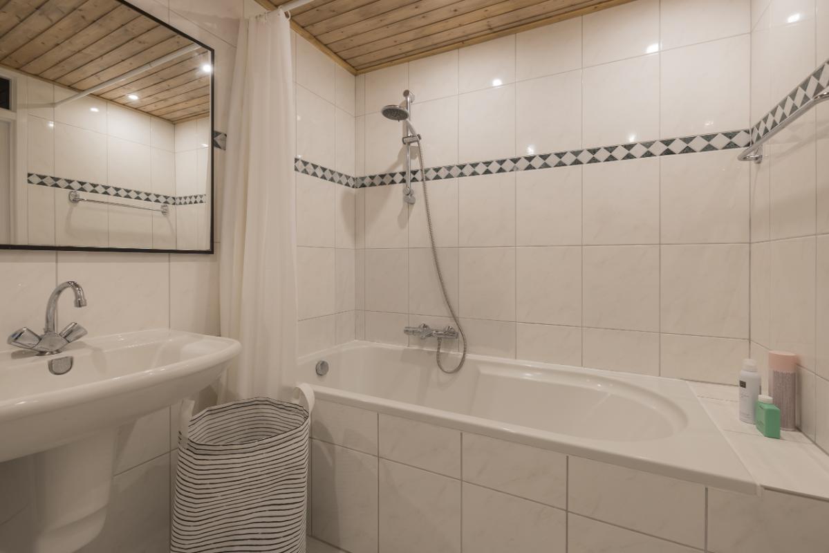 First Floor: The spacious landing provides access to two very generous bedrooms, both spanning the full width of the house. The bedroom at the front features a sliding door wardrobe and shutters; the rear bedroom, also with a built-in closet, was created from two rooms and can easily be split again. The centrally located bathroom is finished in light colors and features a bathtub/shower, wall-mounted toilet, and washbasin. The rooms also feature the same whitewashed laminate flooring.