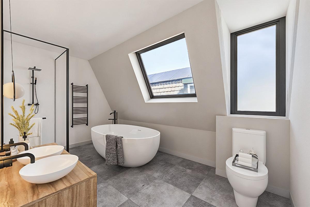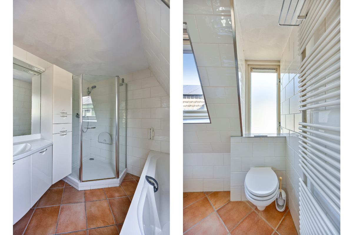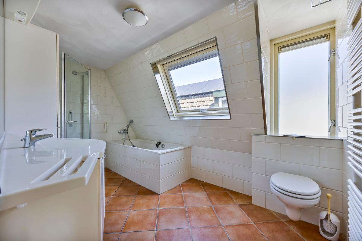 Badkamer: De nette, volledig betegelde badkamer is van alle gemakken voorzien. Er is een douchecabine, een ligbad en een wastafel met een riant meubel, afgewerkt met inbouwspotjes voor een sfeervolle verlichting. Daarnaast beschikt de ruimte over een vrijhangend toilet, een handdoekradiator en zowel een raam als een Velux dakraam, wat zorgt voor natuurlijk licht en extra ventilatie. Een comfortabele en verzorgde ruimte om de dag ontspannen te beginnen of af te sluiten.