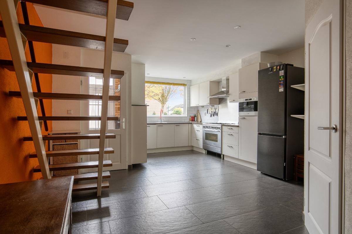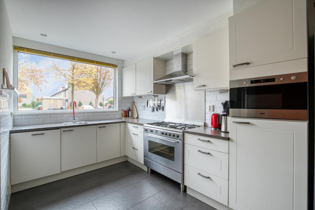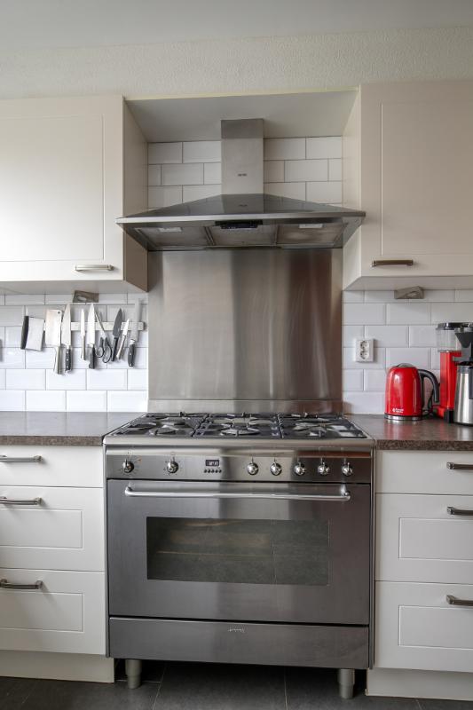 Keuken: Ruime en open woonkeuken (2014) in hoekopstelling aan de voorzijde van de woning. De keuken is voorzien van veel kastruimte, een lang werkblad en (inbouw)apparatuur: een 5-pits gasfornuis inclusief grote oven en afzuigkap en vaatwasser.