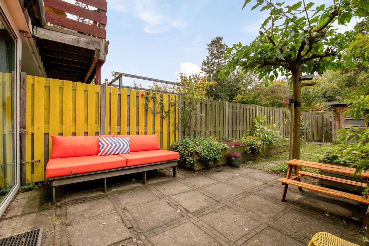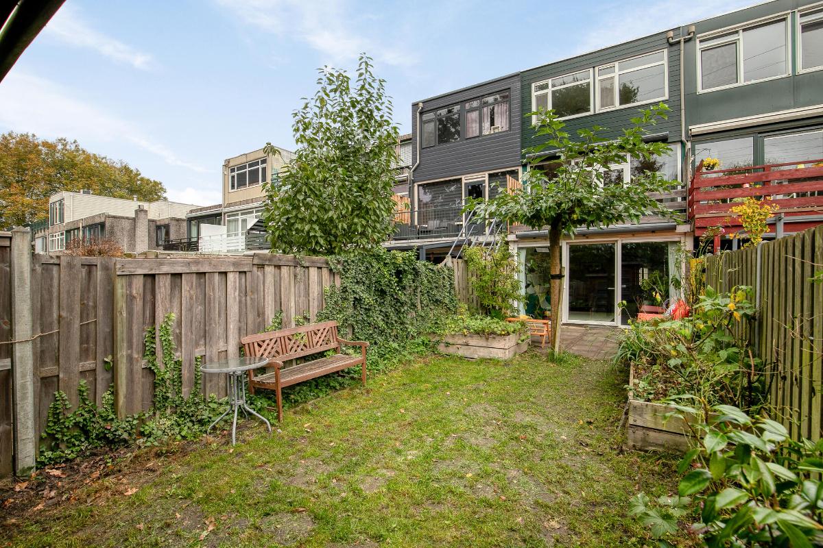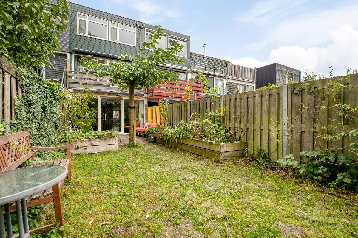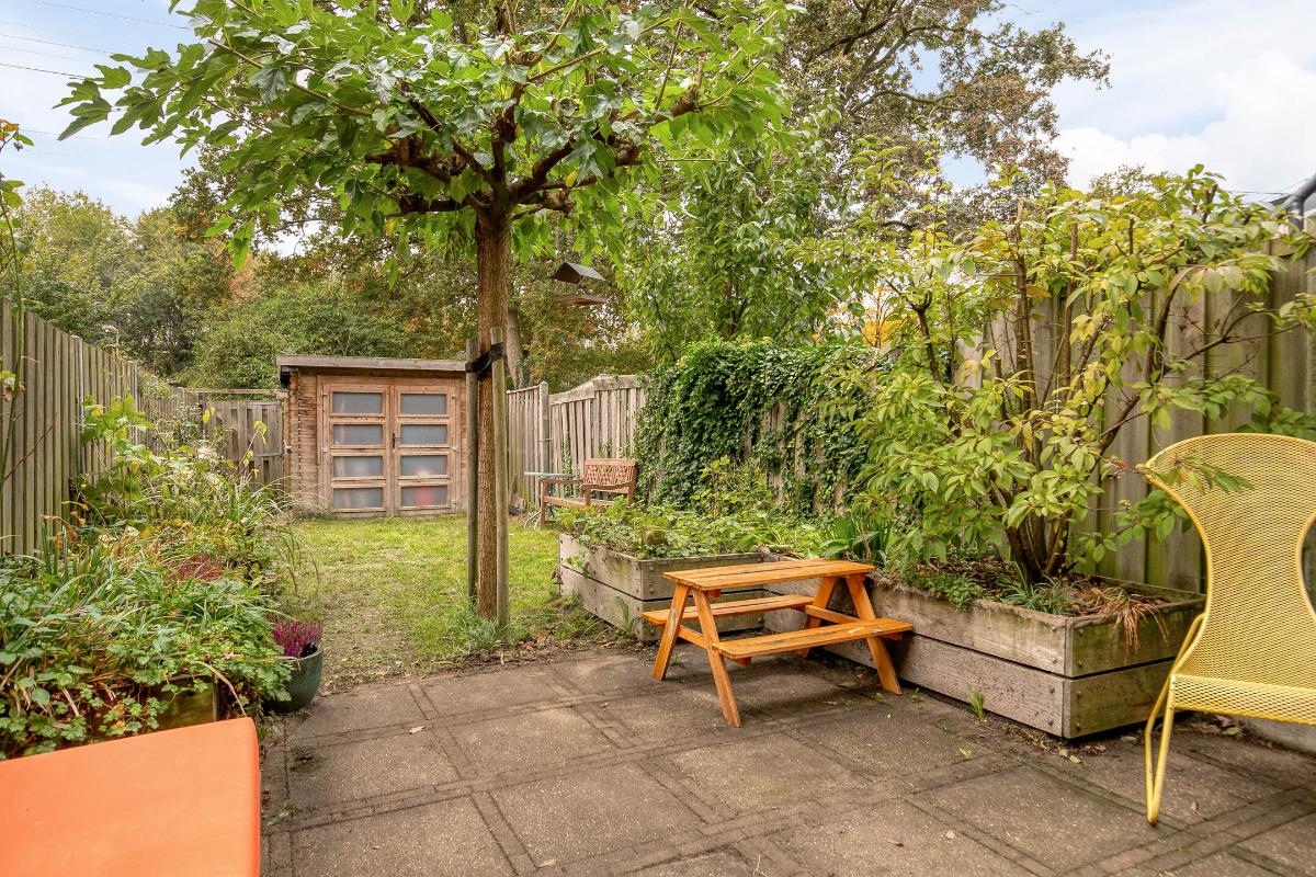 Tuin: De voortuin is geheel bestraat en hier kun je de auto dus op eigen terrein parkeren. De achtertuin is deels voorzien van sierbestrating en veel groen. De diepe achtertuin ligt op het zuidwesten aan het park en de tennisbanen. Via de achterom sta je zo tussen het groen.