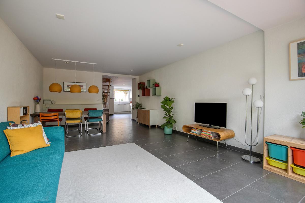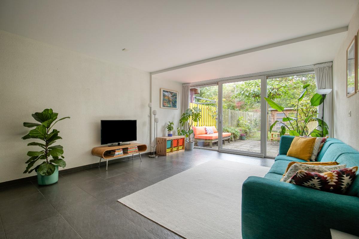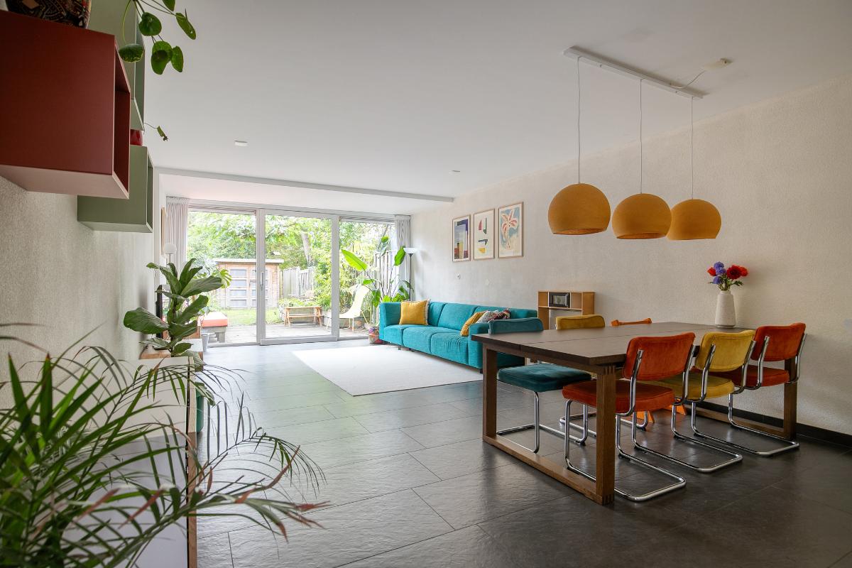 Woonkamer: De woonkamer ligt aan de achterzijde van de woning en is heerlijk ruim. Op de vloer ligt een plavuizen vloer en is voorzien van vloerverwarming. Via de grote schuifpui loop je zo de heerlijke achtertuin in met vrij uitzicht over het park. Vanaf de eettafel kijk je heerlijk weg. Een fijne plek om te samen te komen, te eten of te werken.