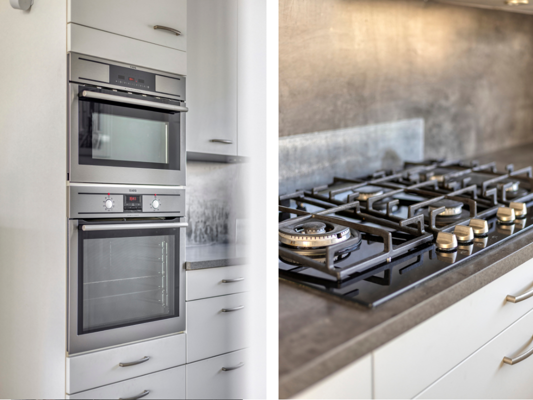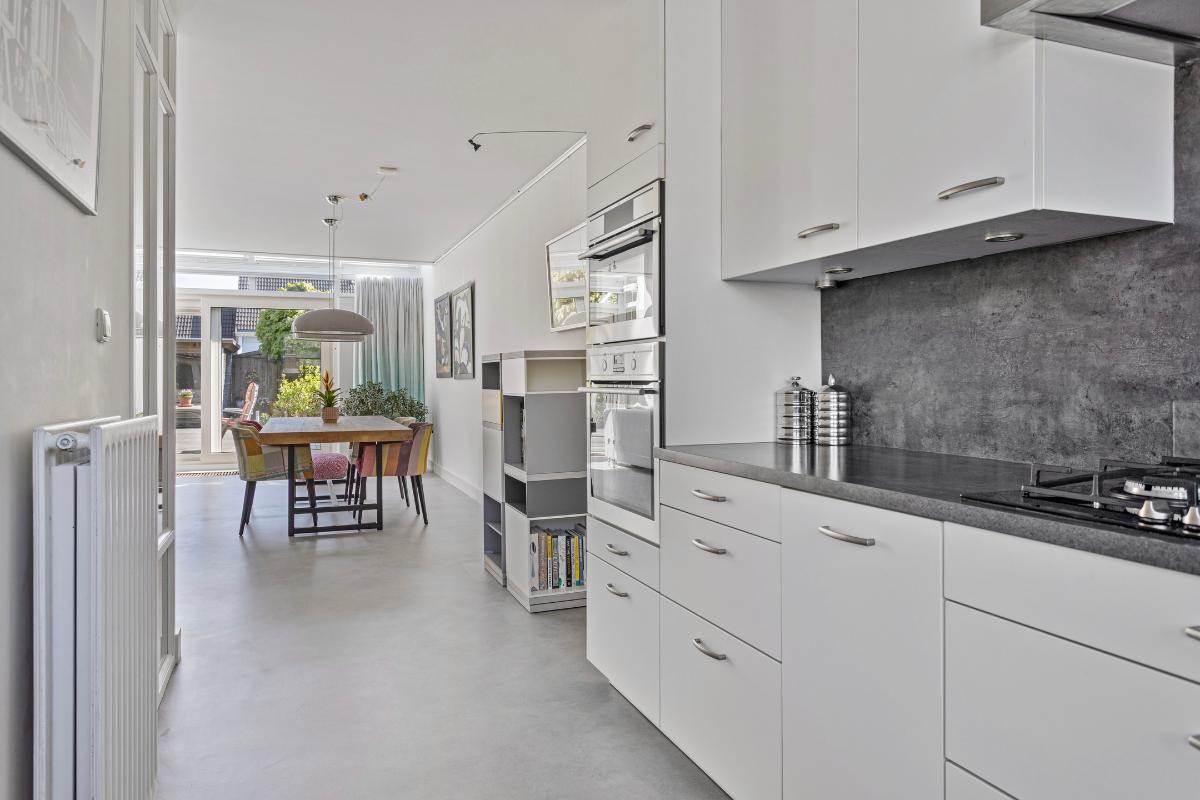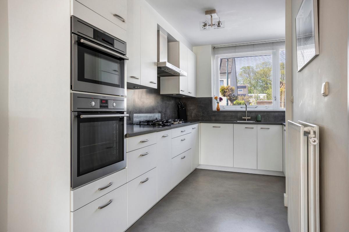 Keuken: De open keuken is geplaatst in een praktische U-opstelling en biedt volop werk- en opbergruimte. De keuken is voorzien van een vijfpits gaskookplaat, inclusief een wokbrander, met een afzuigkap. Daarnaast beschikt de keuken over zowel een oven als een combimagnetron, een vaatwasmachine, een koelkast en een enkele spoelbak met kraan. Dankzij de grote raampartijen bij de keuken valt er veel natuurlijk licht naar binnen, wat zorgt voor een prettige en heldere werkruimte.