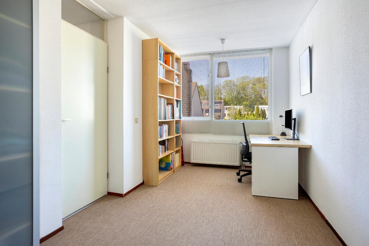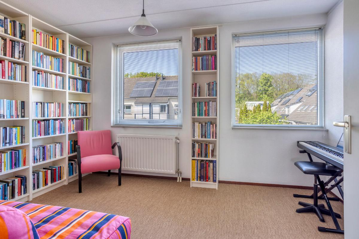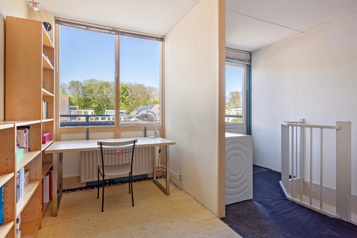 2e verdieping/slaapkamer: De 2e verdieping/slaapkamer is ingericht als een fijne werkruimte en bevindt zich aan de voorzijde van de woning. Deze kamer is voorzien van een praktische inbouwkast met schuifdeuren, wat zorgt voor extra opbergruimte. Vanuit de kamer stapt u zo het balkon op, gelegen op het noordwesten, waar u vanaf de middag tot in de avond van de zon kunt genieten. Daarnaast biedt de kamer plaats aan de wasmachine- en drogeropstelling, de cv-ketel en de omvormer van de zonnepanelen.