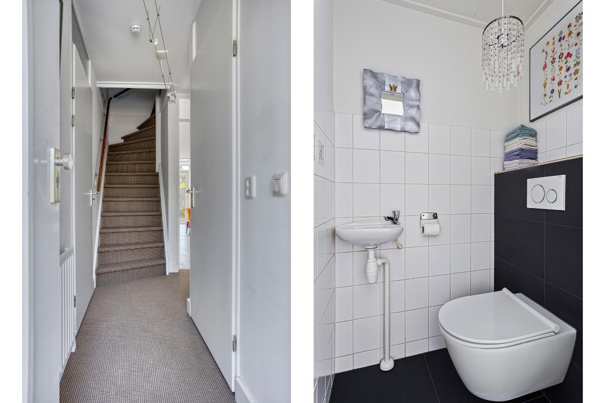 Hal: De hal biedt toegang tot de woonkamer, de berging, een toilet met fonteintje en een vaste trapopgang tot de 1e verdieping. De hal is voorzien van de meterkast.