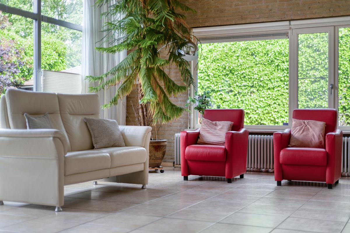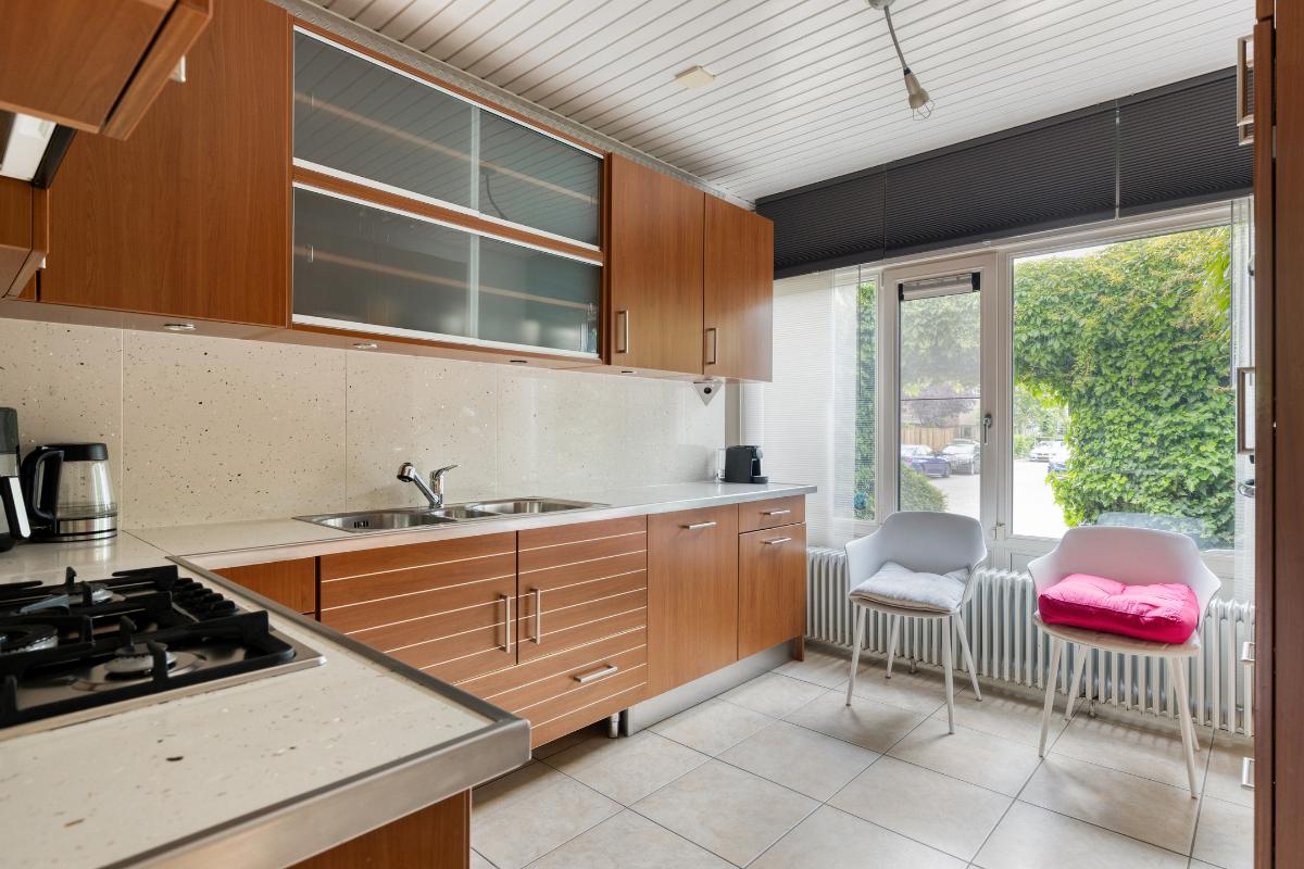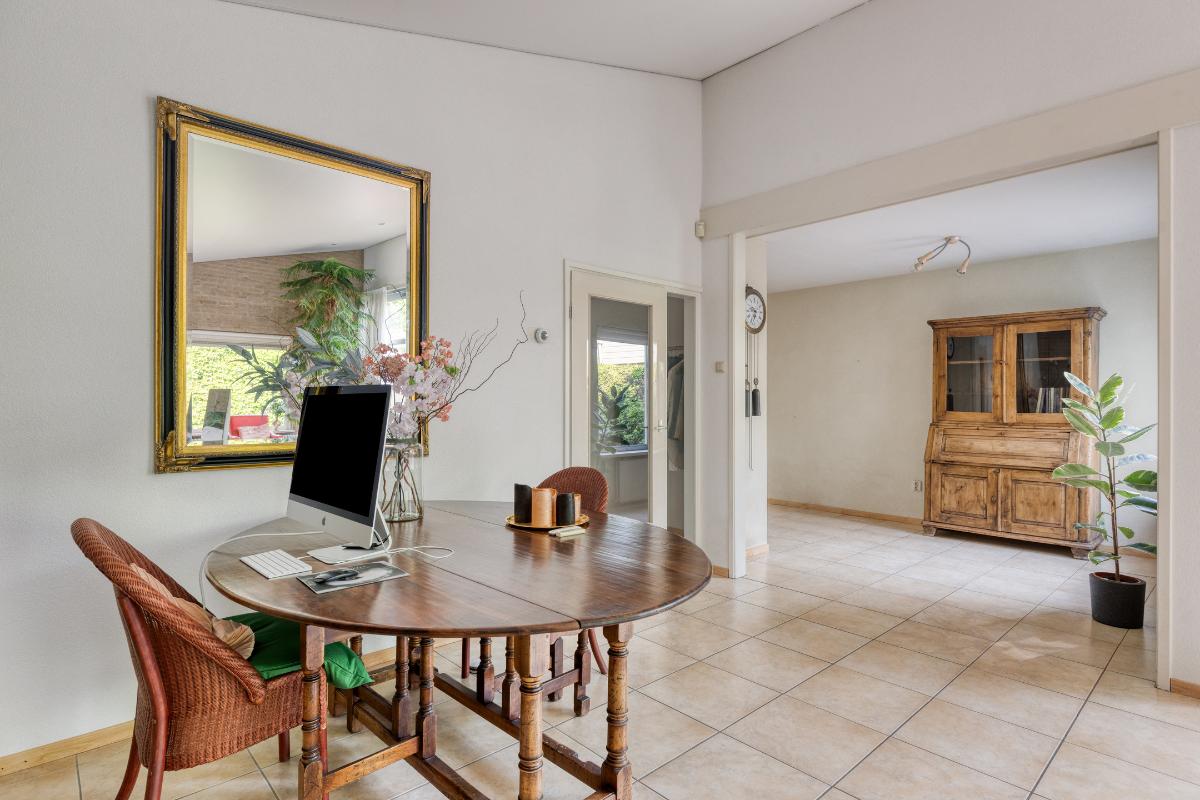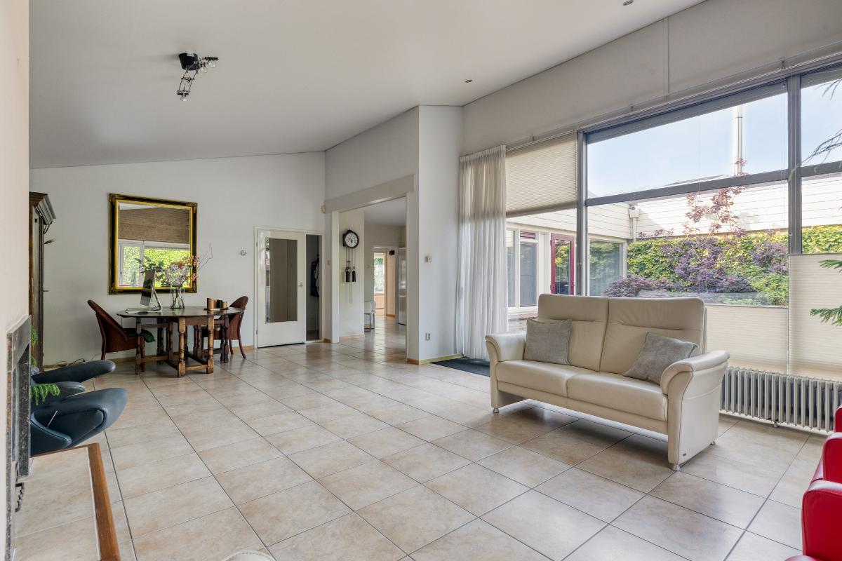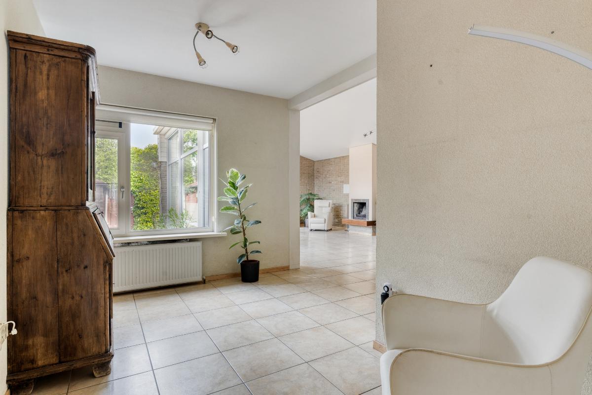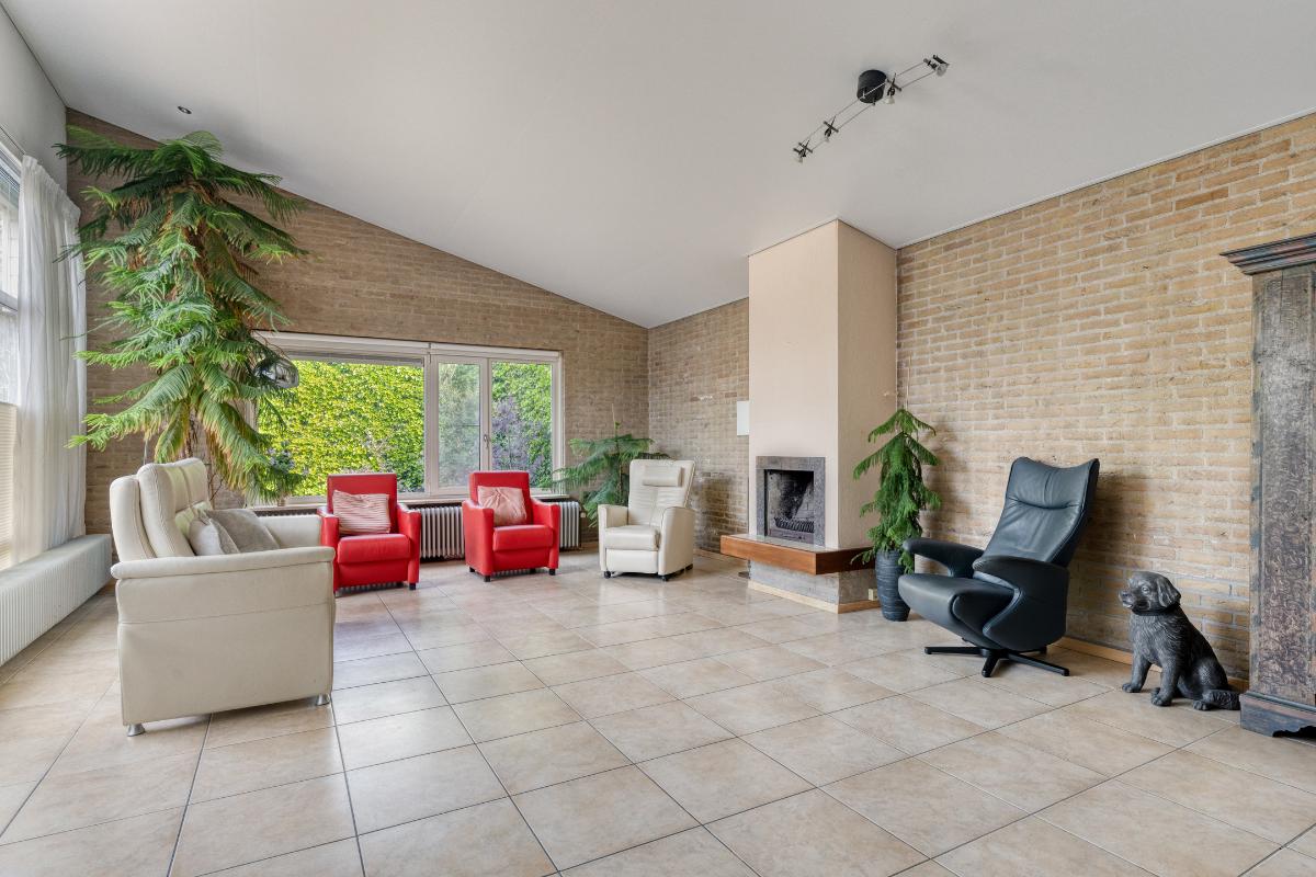 Woonkamer: De royale woonkamer is een aangename en sfeervolle ruimte, gekenmerkt door het hoge schuine dak, de aluminium schuifpui en een royale raampartij, die samen zorgen voor veel lichtinval en een prettige verbinding met de achtertuin. Dankzij de aanwezige vloerverwarming geniet u hier van extra comfort, terwijl de open haard bijdraagt aan een warme en gezellige sfeer. De ruimte is afgewerkt met horren, plisségordijnen, gordijnen en rolgordijnen wat zorgt voor een nette en praktische afwerking. Bovendien is de woonkamer uitgerust met elektrische screens, waarmee u de zon eenvoudig buiten houdt en het binnen aangenaam koel blijft. Daarnaast is de voormalige muur van een slaapkamer doorgebroken, waardoor er extra ruimte is gecreëerd – een ideaal hoekje om rustig een boek te lezen.