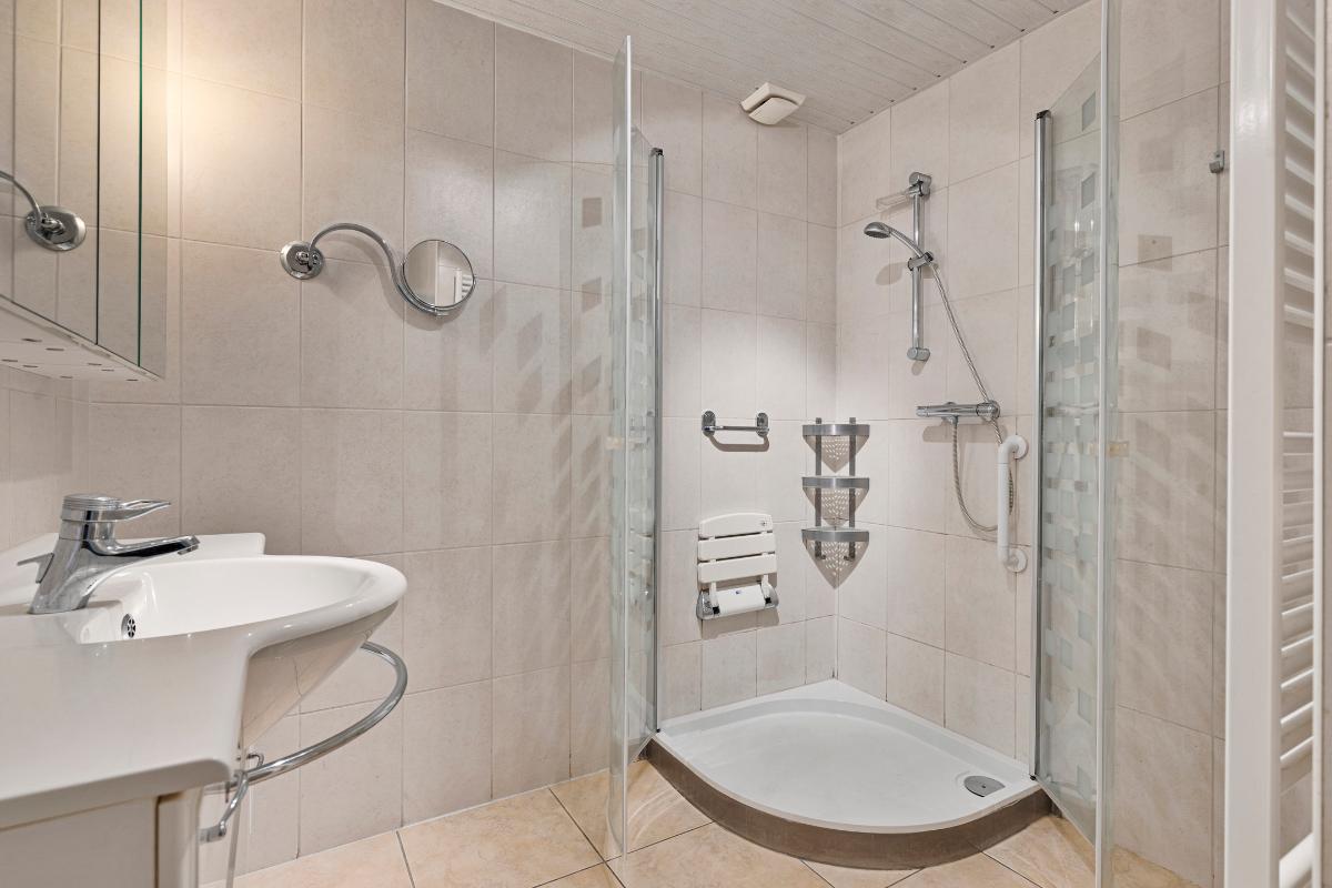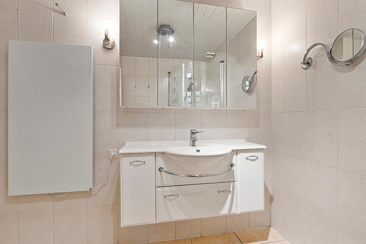 Badkamer: De volledig betegelde badkamer is voorzien van een douchecabine, een wastafel met wastafelmeubel en een handdoekradiator voor extra comfort. Daarnaast beschikt de ruimte over een paneelverwarming met afstandsbediening, een grote spiegelkast met opbergruimte en een vergroot spiegel. Deze combinatie maakt de badkamer zowel functioneel als aangenaam in gebruik.