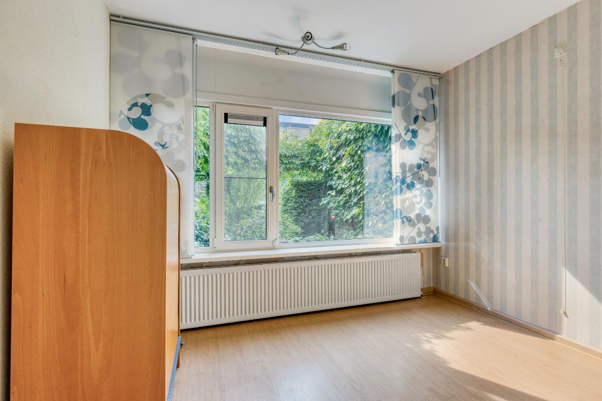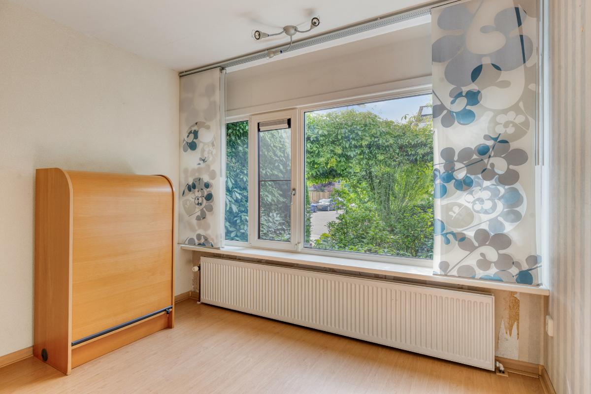 Slaapkamers: Slaapkamer 1: Deze slaapkamer, gelegen aan de voorzijde van de woning, biedt een prettig uitzicht over de verzorgde voortuin. De ruimte is afgewerkt met paneelgordijnen, die zorgen voor een praktische raamdecoratie.