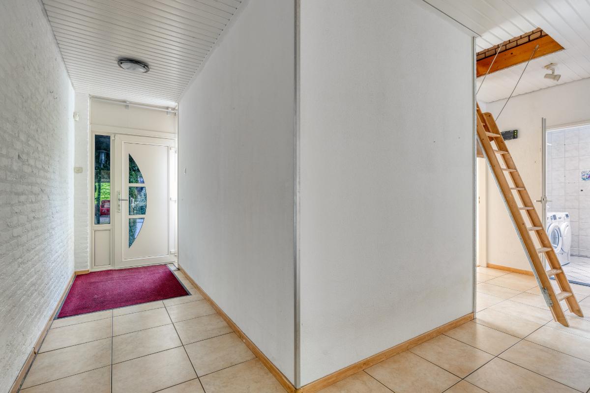 Hal: De hal vormt het centrale punt van de woning en is uitgerust met de meterkast en een hoek voor het ophangen van jassen. De hal biedt toegang tot de woonkamer, de garage, de badkamer, een apart toilet met fonteintje, twee slaapkamers en de wasruimte. Vanuit de hal bereikt u tevens de half open keuken en via een vlizotrap is de royale bergzolder toegankelijk.
