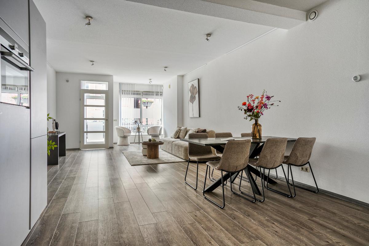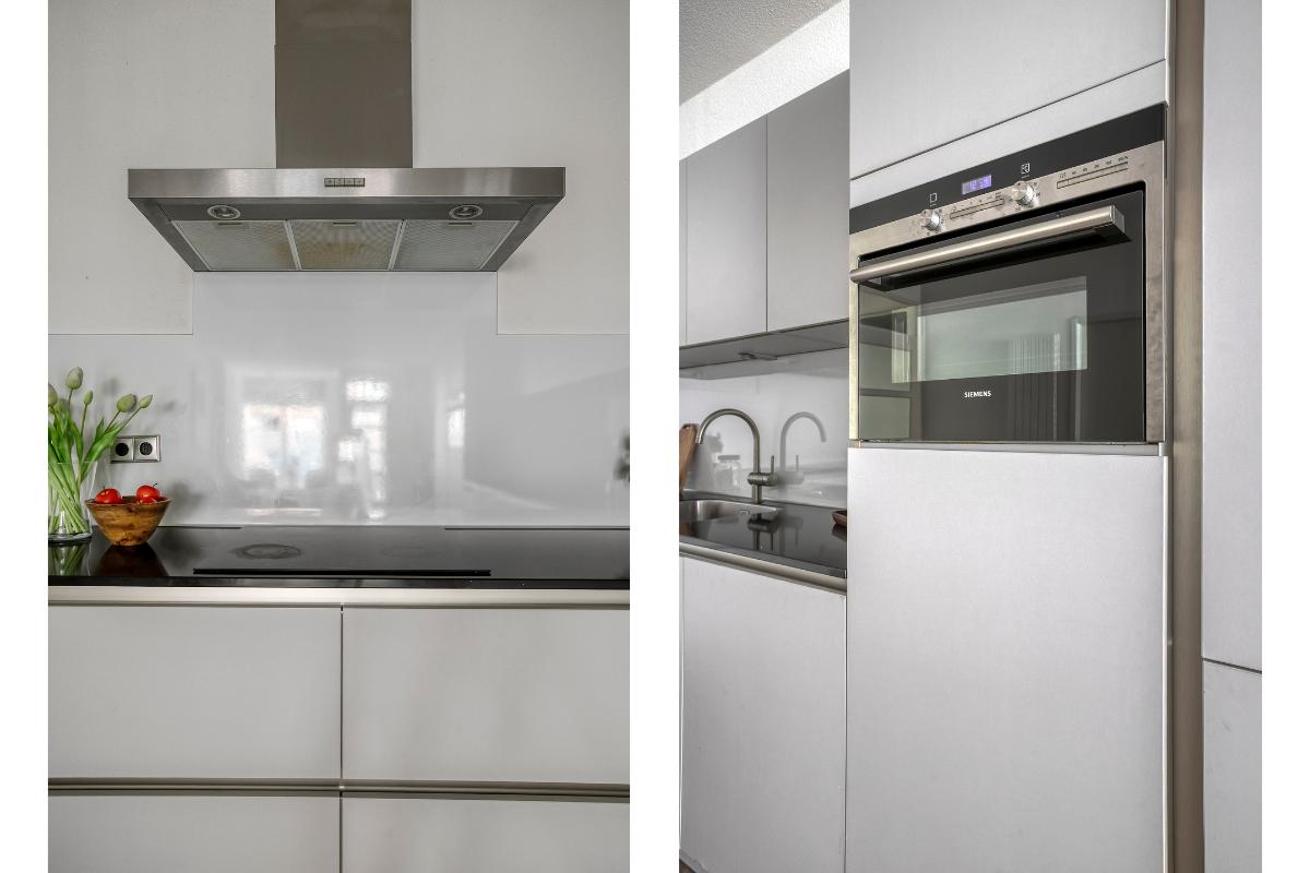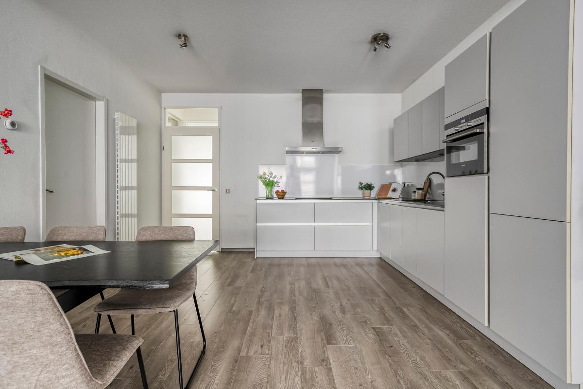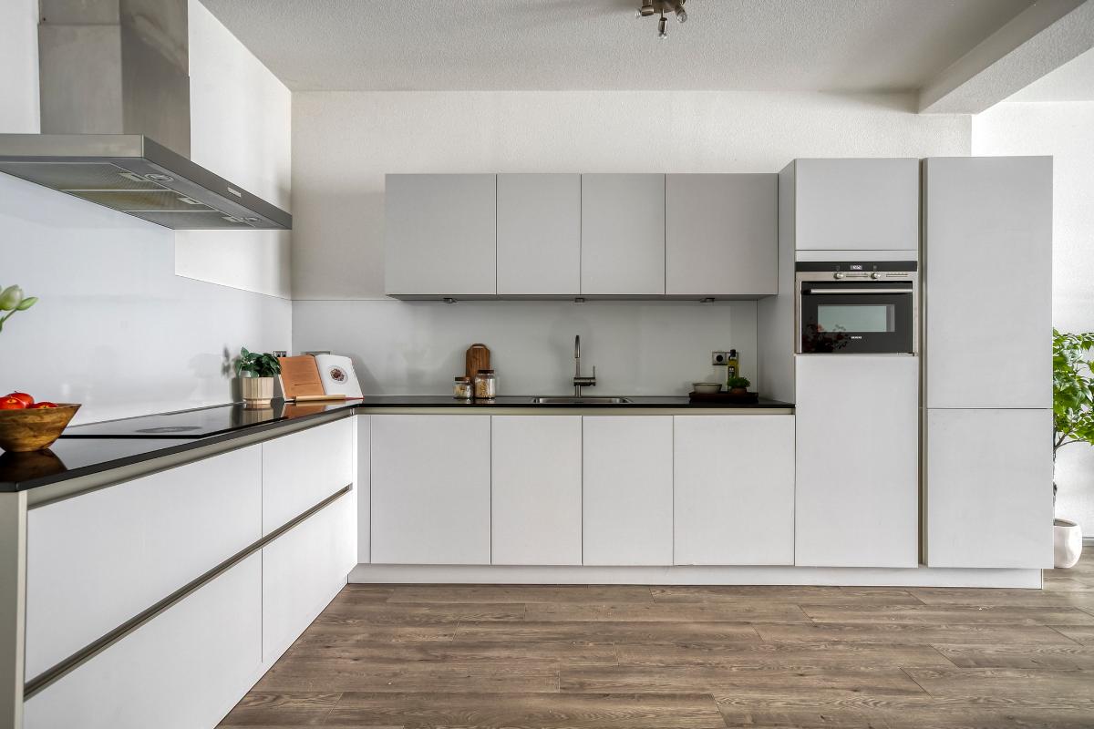 Keuken: De open keuken sluit perfect aan op de riante woonkamer en is uitgerust met diverse moderne voorzieningen. De keuken is voorzien van een inductiekookplaat met bijpassende afzuigkap, een oven met combifunctie, een ingebouwde koelkast en een vaatwasmachine. Ook aan praktische details is gedacht, zoals een inbouw prullenbak onder de spoelbak en ruime opbergmogelijkheden. De enkele spoelbak met kraan, de ingebouwde spotverlichting en het granieten aanrechtblad zorgen voor een strakke en verzorgde uitstraling, passend bij het open karakter van deze fijne leefruimte.