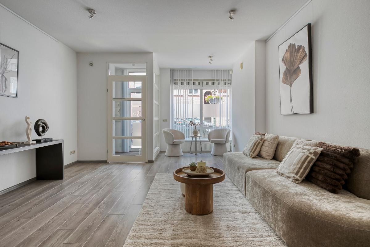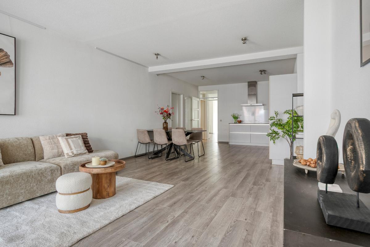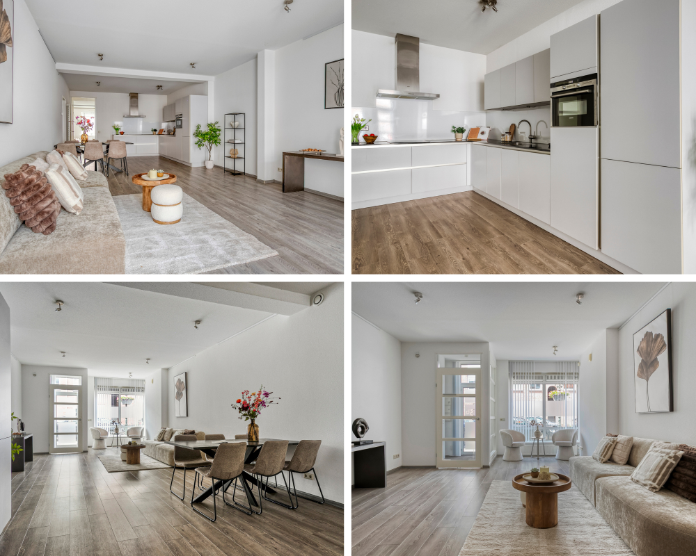 Woonkamer: Deze lichte en verrassend diepe woonkamer van circa 10 meter vormt het hart van de woning en sluit naadloos aan op de open keuken, waardoor een ruimtelijk en sfeervol geheel ontstaat. Vanuit deze centrale leefruimte zijn twee gangen bereikbaar: de eerste biedt toegang tot het separate toilet en de bijkeuken, terwijl de tweede gang leidt naar de badkamer en twee royale slaapkamers.