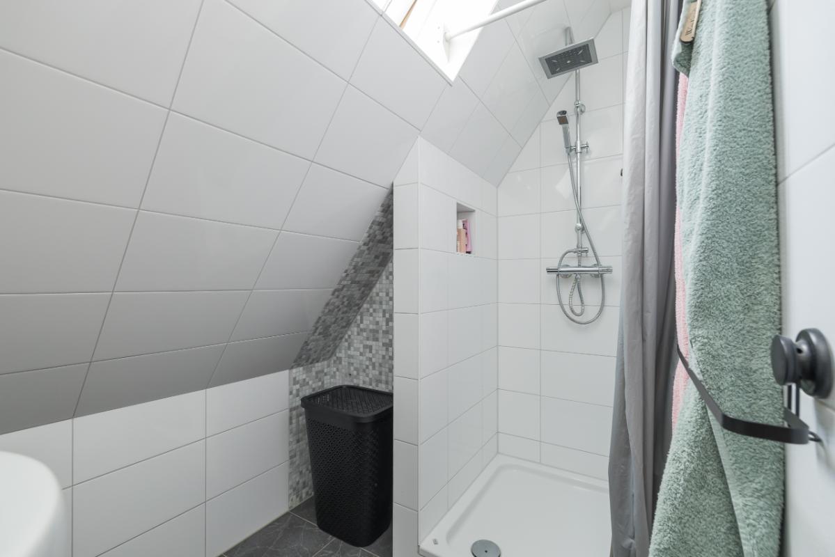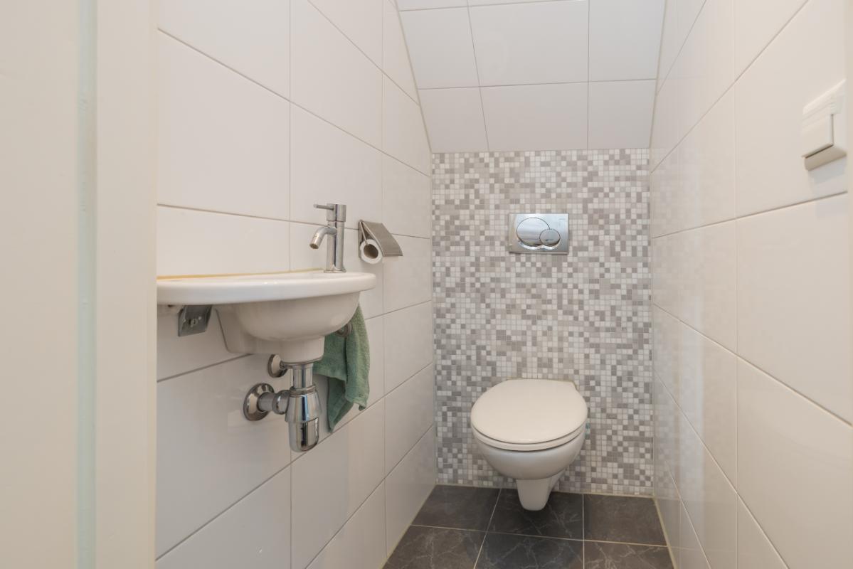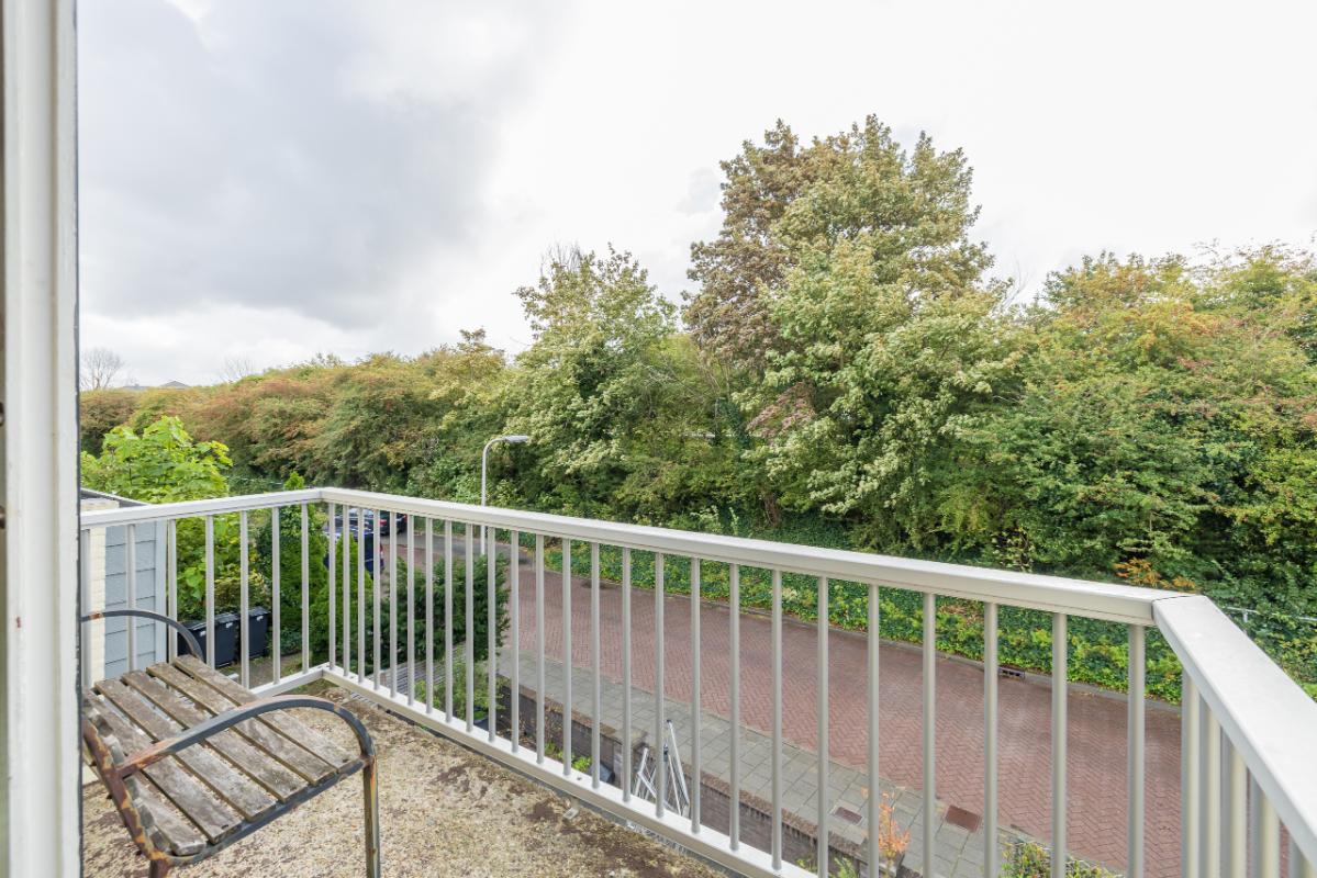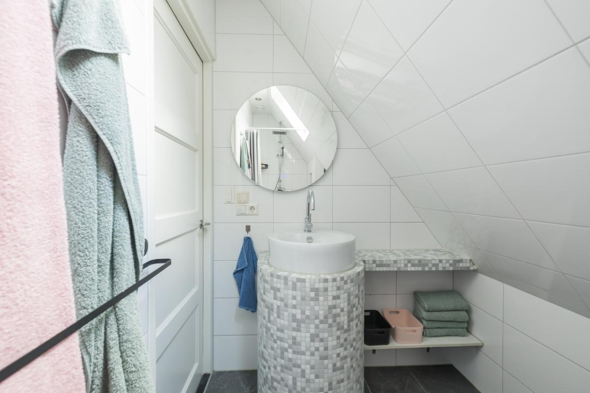 1e Etage Overloop met een praktische (garderobe)kast. Het moderne toilet (grijs/wit) is voorzien van een fonteintje. De nette badkamer beschikt over een douchecabine, rond meubel met waskom, verwarmde spiegel en mechanische ventilatie. De ruime (ouder)slaapkamer is voorzien van een dakkapel en vaste kast. Sfeervolle woonkamer met schuifpui naar het zonnige balkon op het zuid-oosten. De half open keuken in hoekopstelling is uitgerust met een keramische kookplaat, combi-magnetron/oven en dakkapel. Vanuit de woonkamer leidt een vaste trap naar de tweede verdieping.
