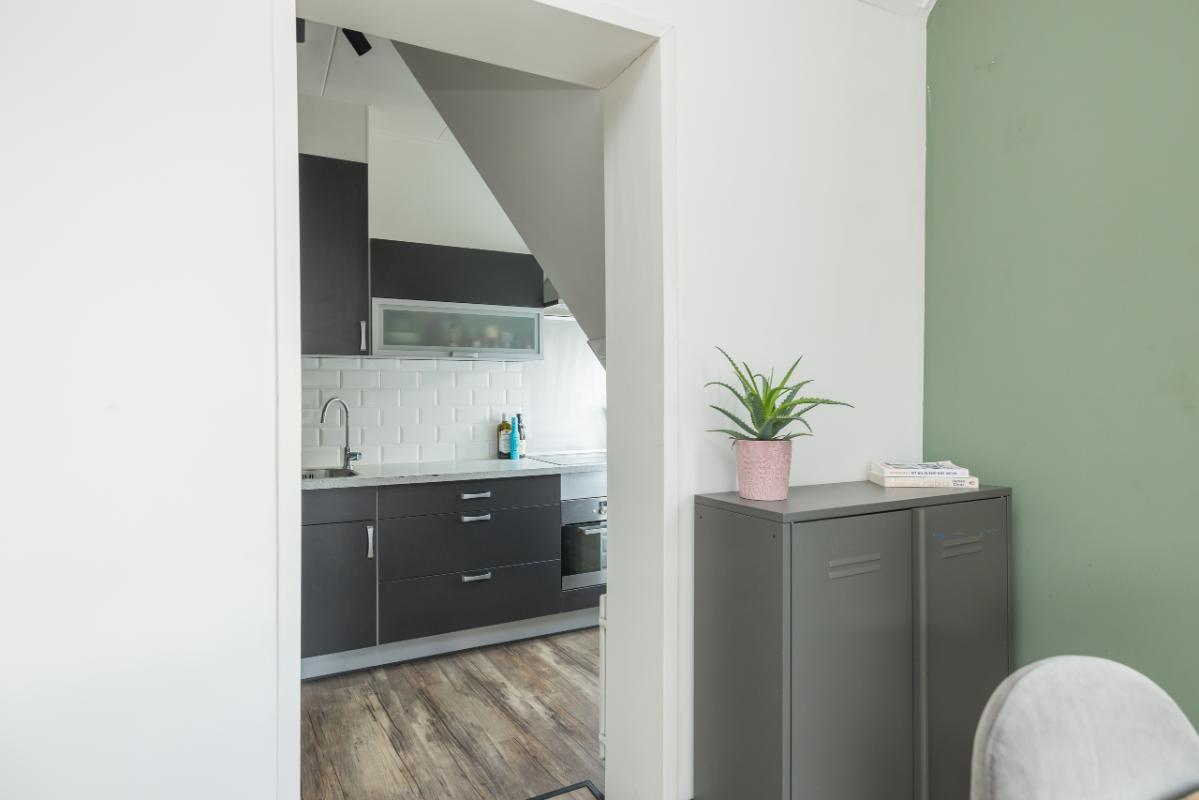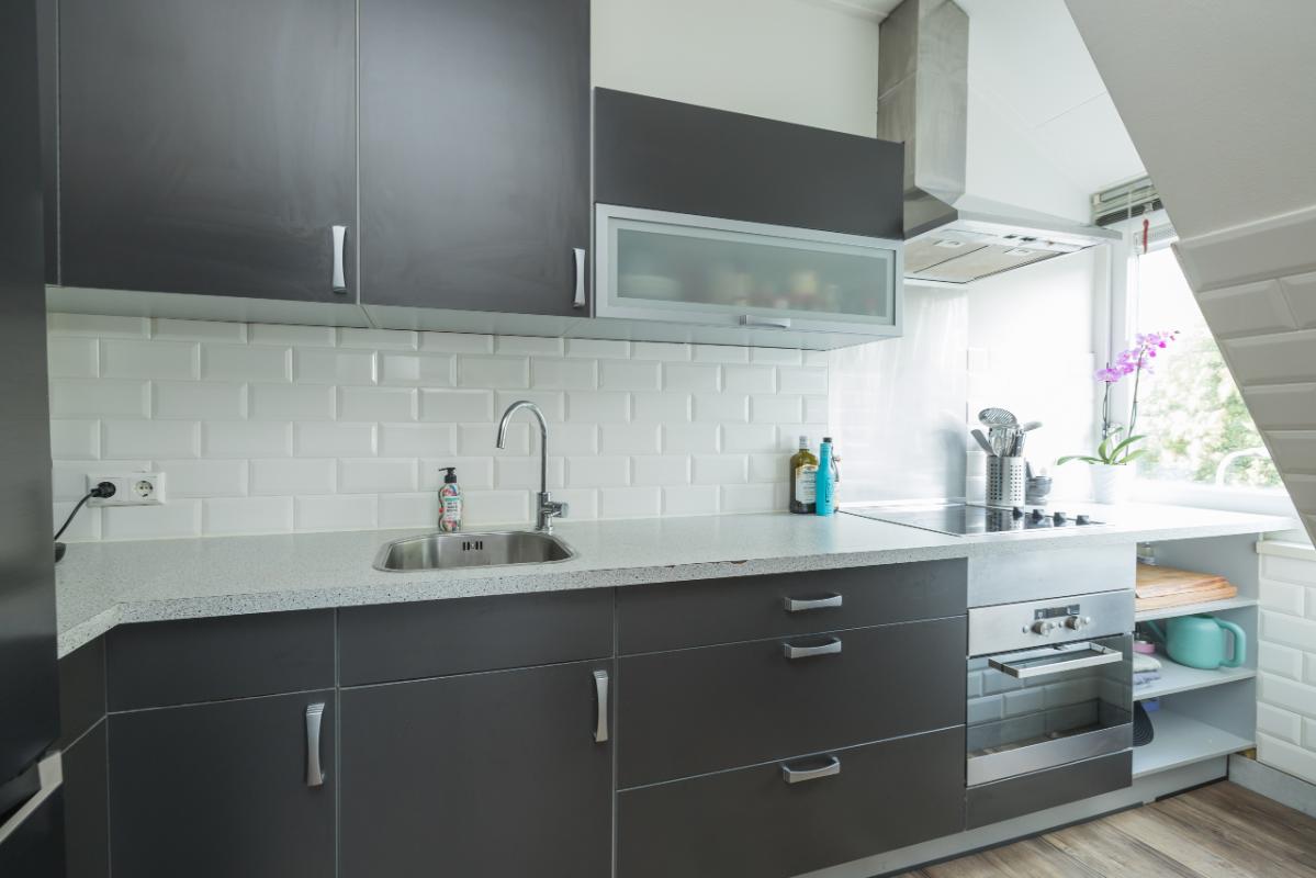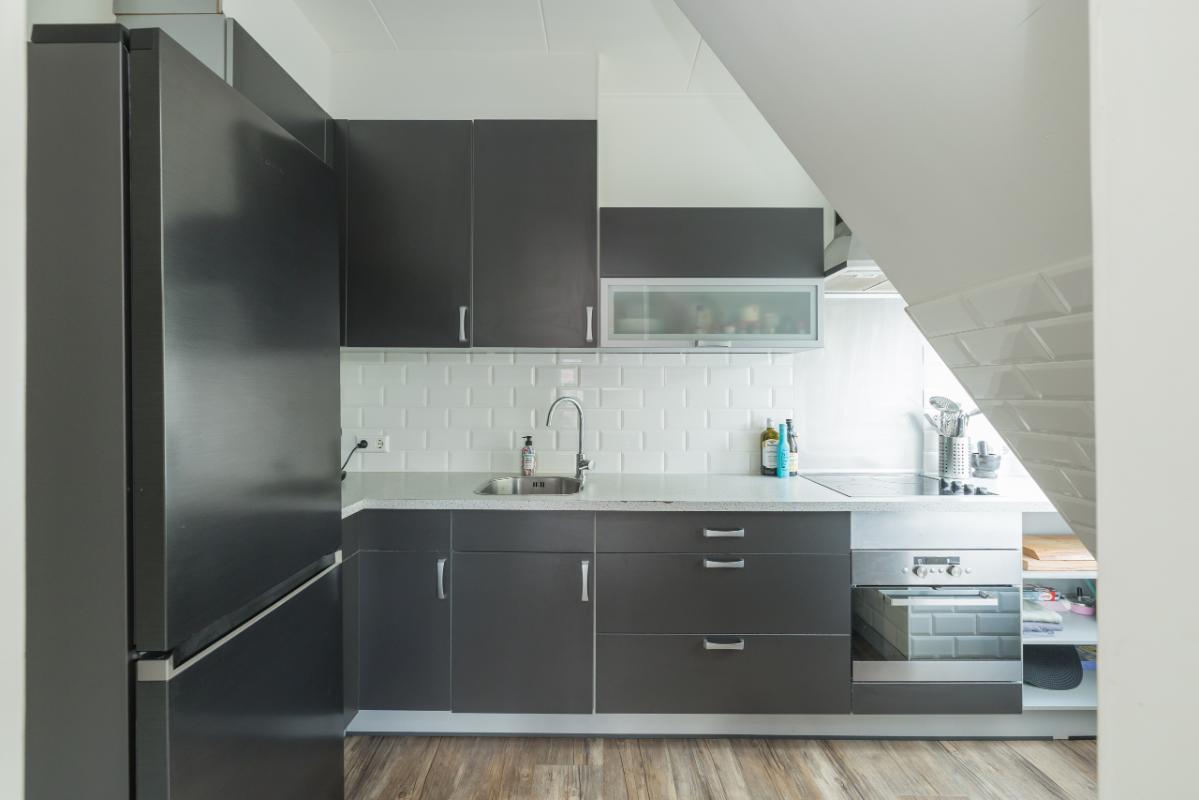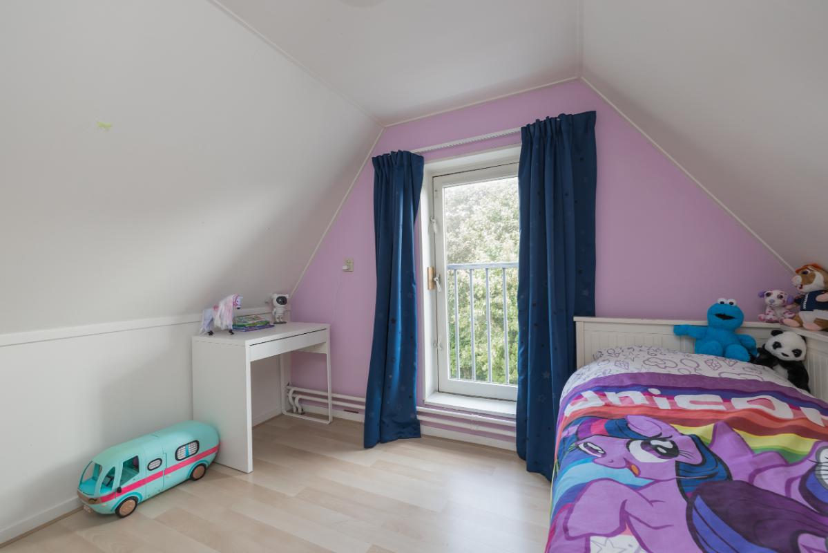 1e Etage Overloop met een praktische (garderobe)kast. Het moderne toilet (grijs/wit) is voorzien van een fonteintje. De nette badkamer beschikt over een douchecabine, rond meubel met waskom, verwarmde spiegel en mechanische ventilatie. De ruime (ouder)slaapkamer is voorzien van een dakkapel en vaste kast. Sfeervolle woonkamer met schuifpui naar het zonnige balkon op het zuid-oosten. De half open keuken in hoekopstelling is uitgerust met een keramische kookplaat, combi-magnetron/oven en dakkapel. Vanuit de woonkamer leidt een vaste trap naar de tweede verdieping.
