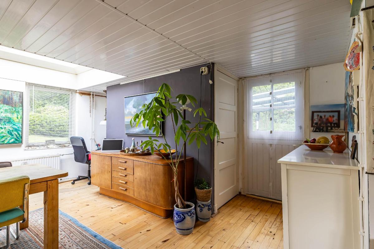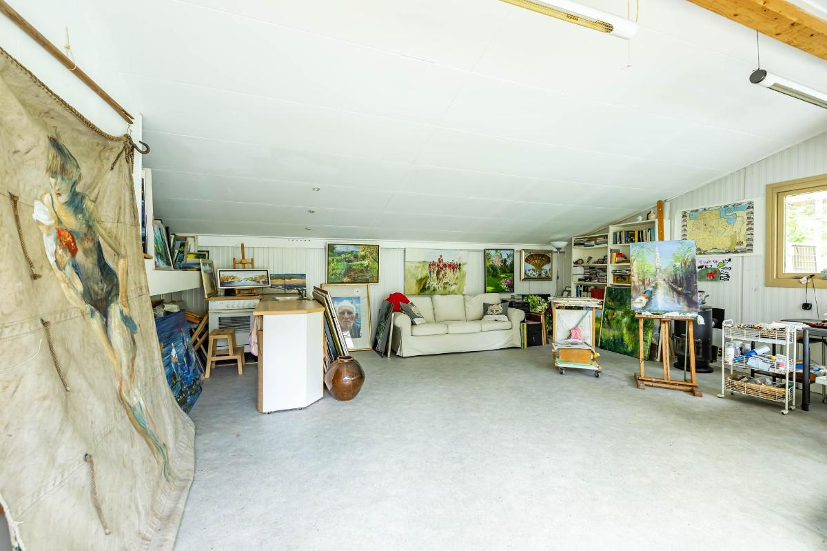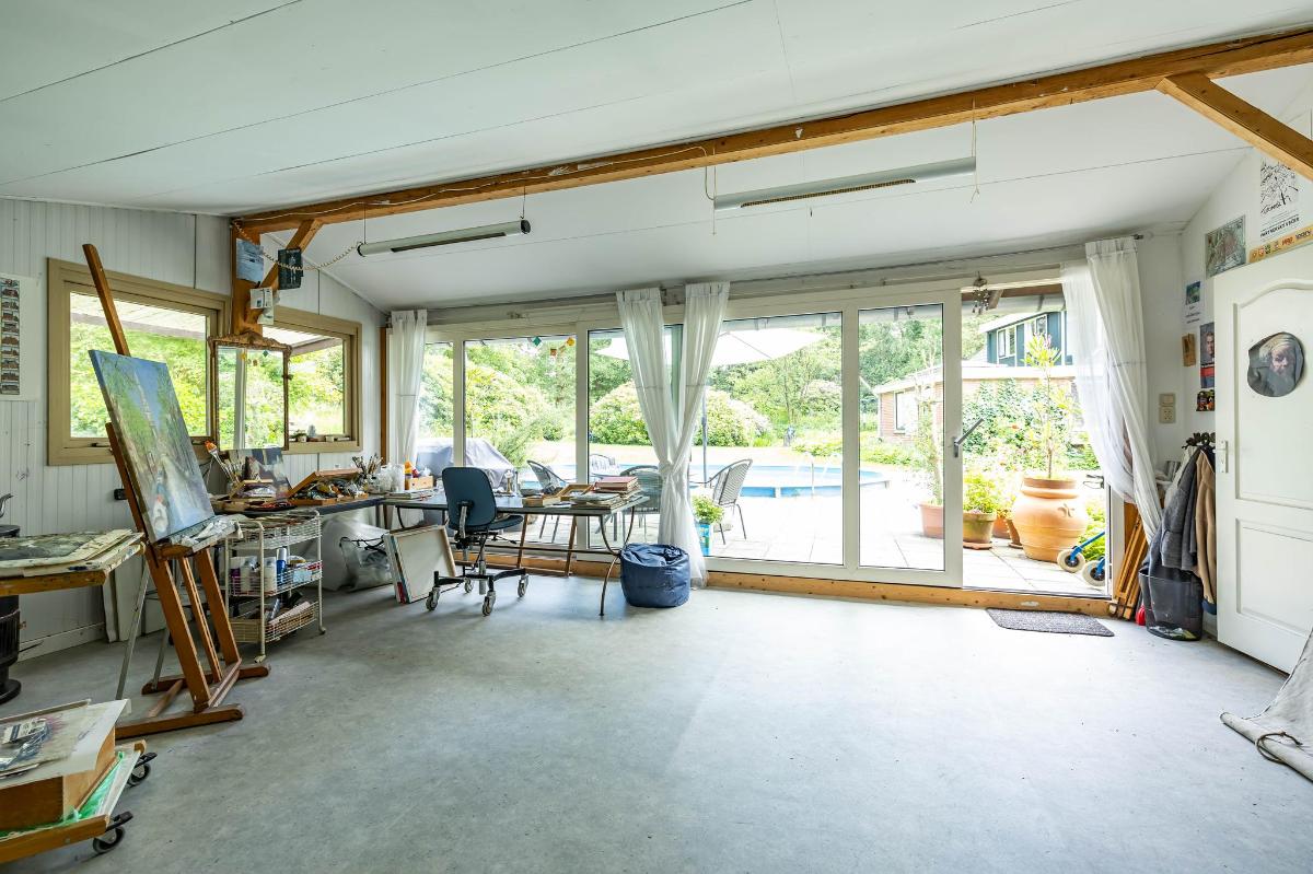Bijgebouw: Het ruime bijgebouw biedt zeeën van mogelijkheden en dankzij de dubbele garage is er altijd voldoende ruimte voor fietsen het (tuin)gereedschap en de auto. Het bijgebouw is voorzien van een groot raamkozijn met schuifpui en is op dit moment in gebruik als atelier. Deze grote ruimte biedt ook mogelijkheden voor gastenverblijf, kantoor- praktijkruimte om aan huis te werken of een ‘Bed & Breakfast’. Er is een badkamer aanwezig, deze is voorzien van een douche, wastafel en toilet.