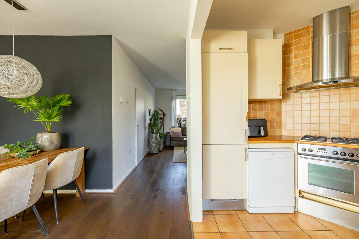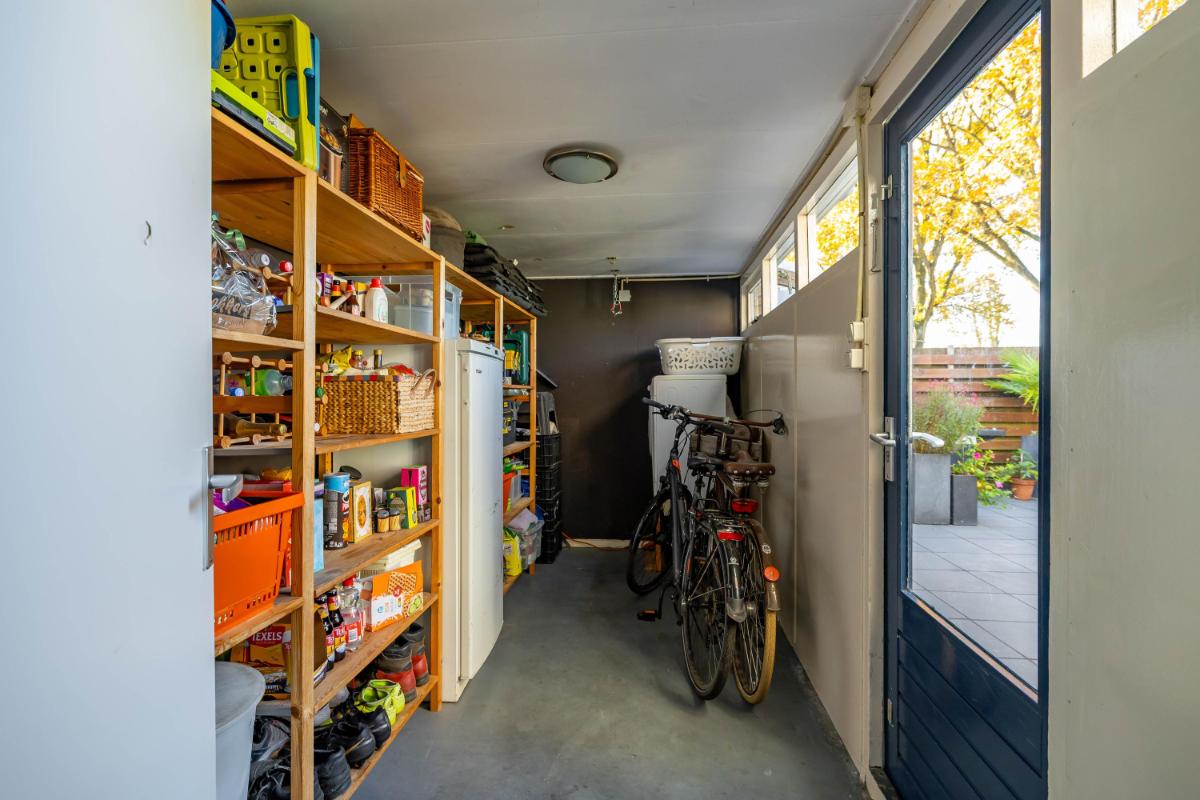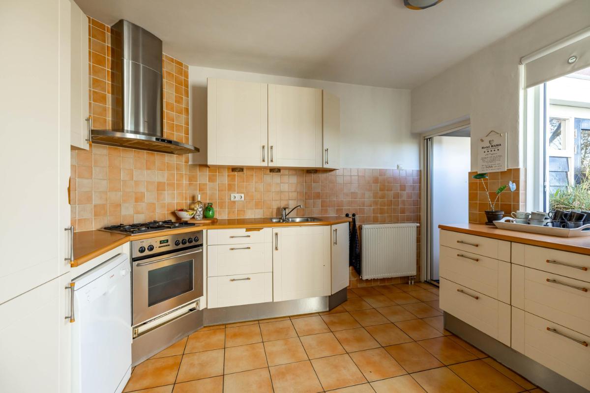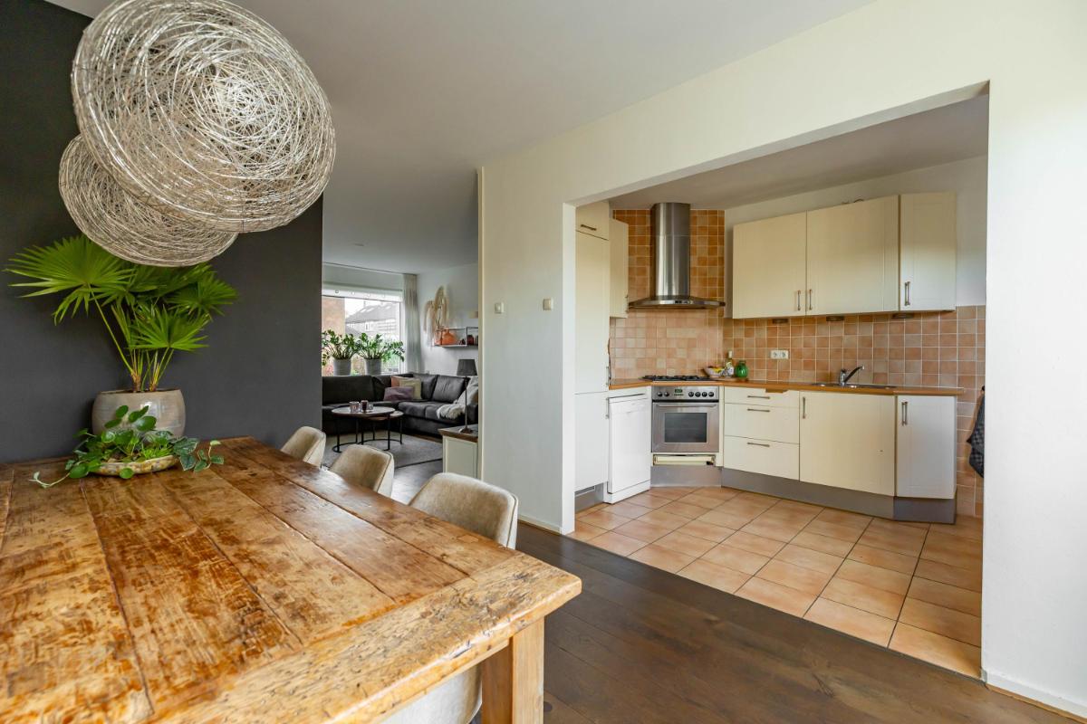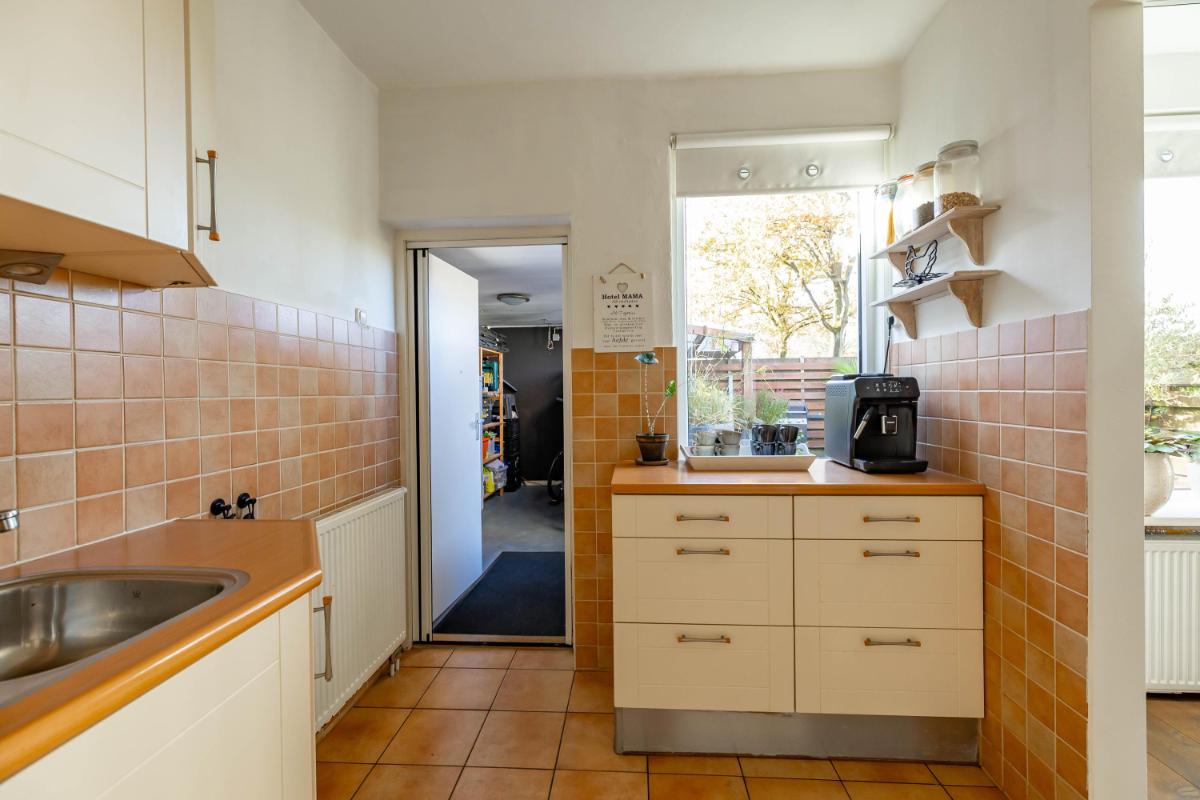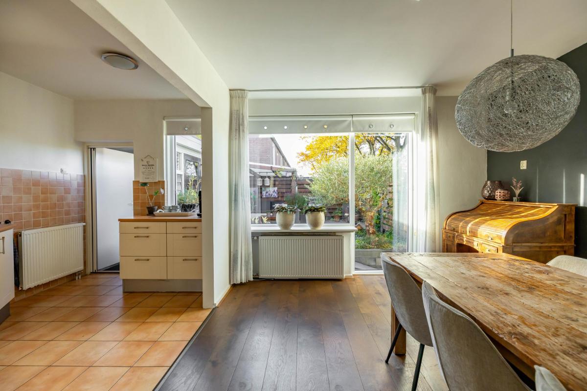 Indeling Begane grond Wanneer je de woning binnenstapt, kom je in een ruime en lichte entree met ruimte voor een garderobe. Hier vind je ook het gastentoilet. Vanuit de hal loop je door naar de sfeervolle woonkamer, waar het daglicht mooi binnenvalt en waar je verschillende gezellige zithoeken kunt creëren. De halfopen keuken sluit hier perfect op aan en is uitgerust met diverse inbouwapparatuur, zoals een vaatwasser en koel-vriescombinatie. Vanuit de keuken heb je toegang tot de praktische bijkeuken, waar de witgoedaansluiting zich bevindt. Ook kun je vanuit hier direct de tuin in – ideaal voor als je even snel iets wilt ophangen of in de zomer met gemak binnen en buiten afwisselt.