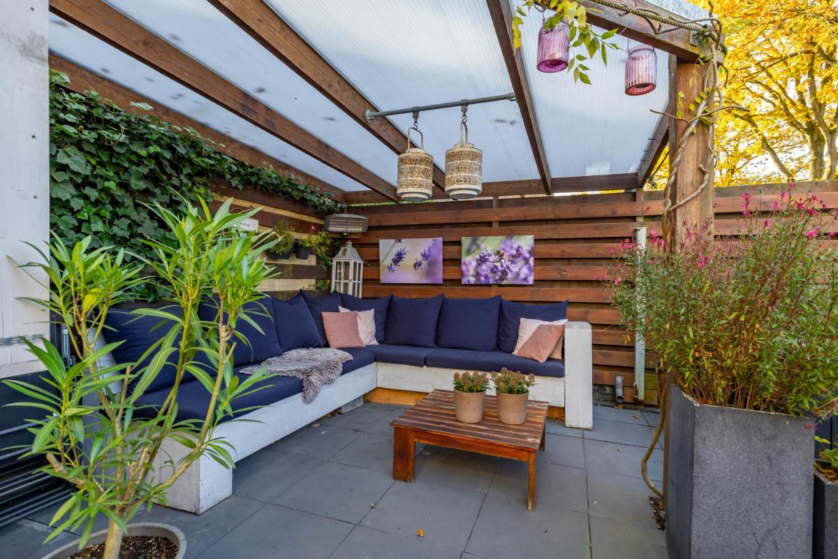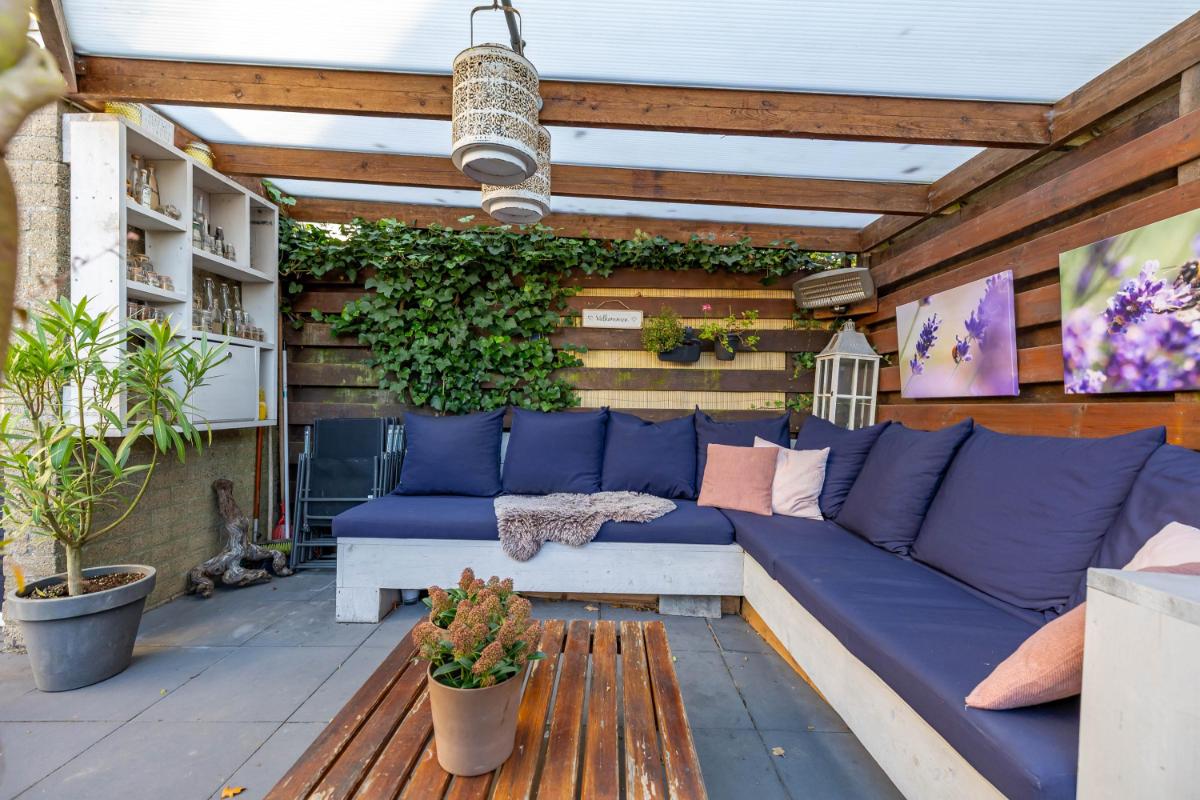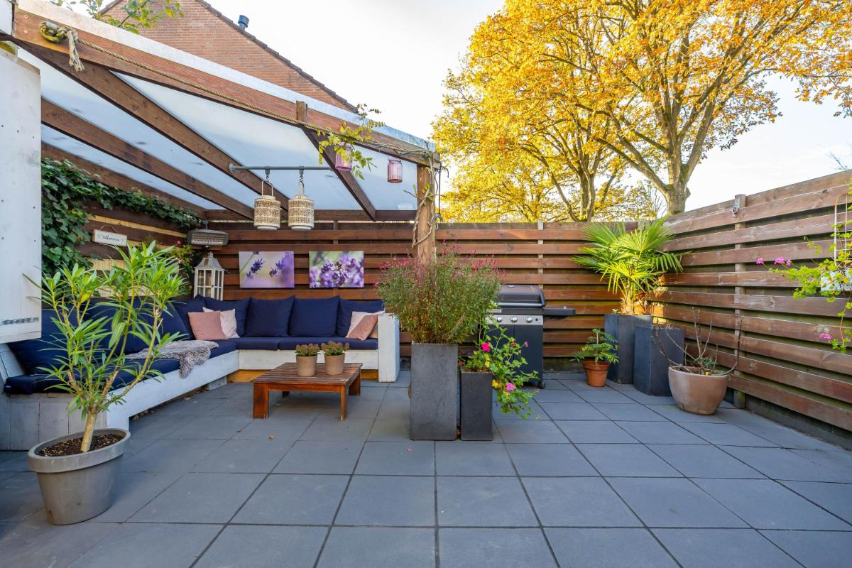 Tuin De tuin ligt op het zuidwesten, waardoor je hier de hele dag door kunt genieten van de zon. De tuin is verzorgd aangelegd en biedt verschillende fijne plekken om te ontspannen. Een echte eyecatcher is de prachtige 100 jaar oude olijfboom! Onder de luxe overkapping kun je een gezellige loungehoek creëren, de ideale plek om op zomeravonden nog even lekker buiten te zitten. Via de achterom is de tuin bovendien gemakkelijk bereikbaar, wat het extra praktisch maakt.
