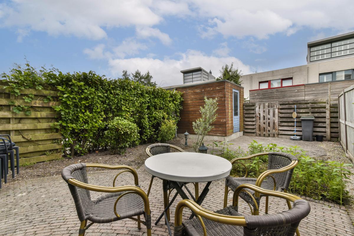 Layout: From the entrance with meter cupboard, staircase to the 1st floor and the toilet with washbasin, the spacious living room with open kitchen is accessible. Just like the rest of the ground floor, the living room has a beautiful solid wooden floor. The open kitchen is located at the front of the house and is equipped with a kitchen unit with built-in appliances such as a combi oven, induction hob, extractor hood and a dishwasher. There is a freestanding fridge/freezer. The living room has a large sliding door at the rear that gives access to the backyard that is located on the Northwest. Here you can enjoy the sun in the afternoon and evening. The house is equipped with an electrically operated sunshade at the rear. The garden has decorative paving and borders with permanent plants. At the back of the garden there is a freestanding wooden shed and there is a back entrance that gives access to the back path.