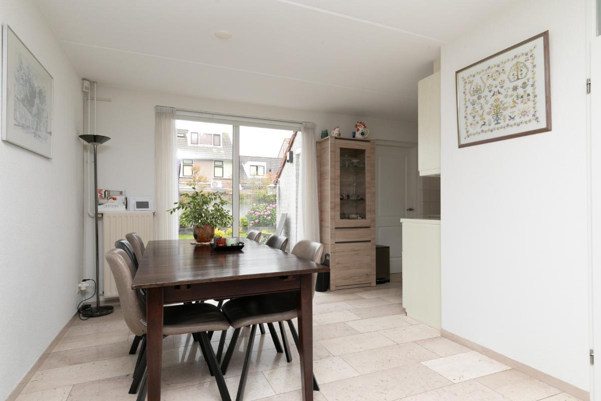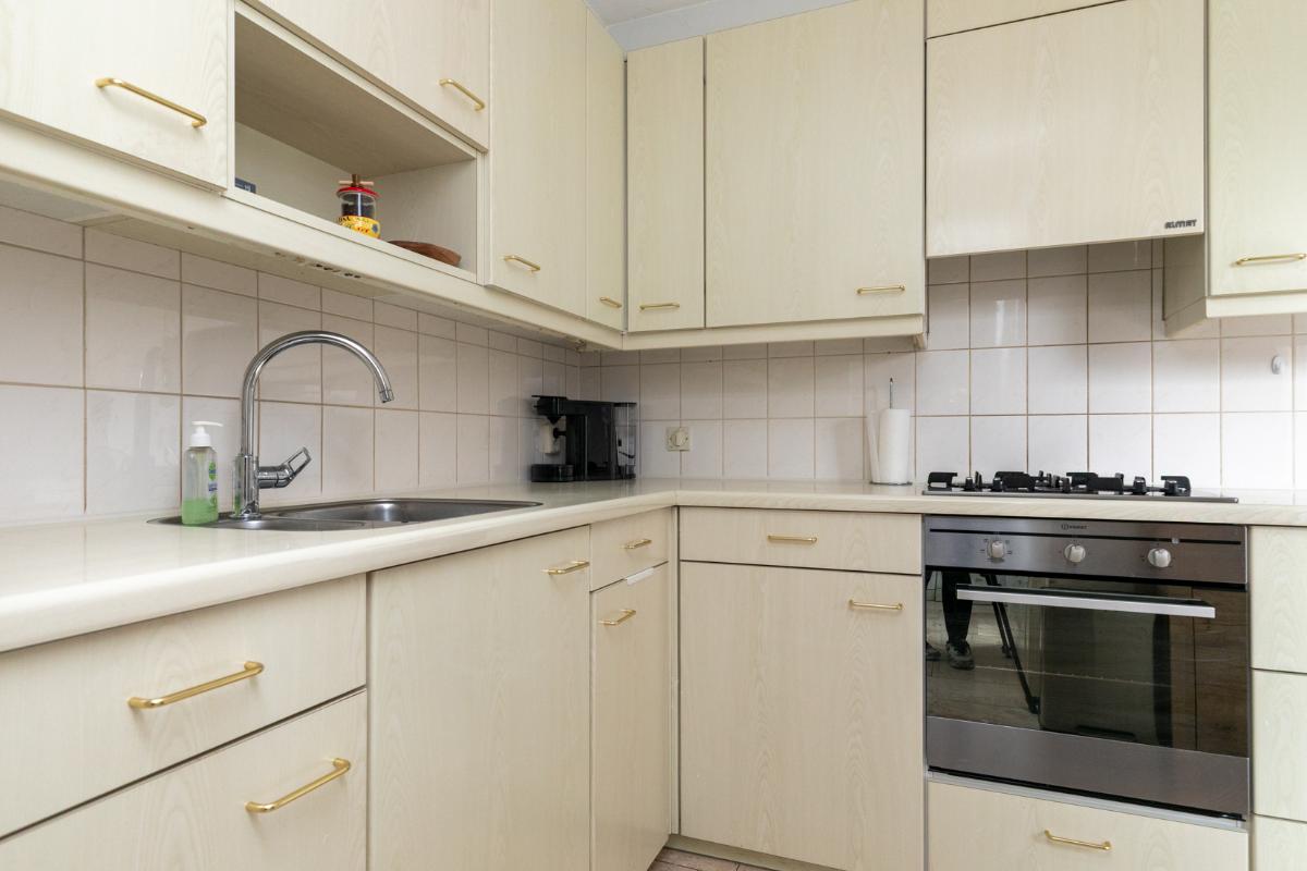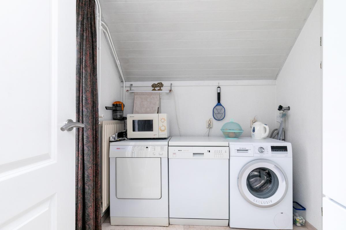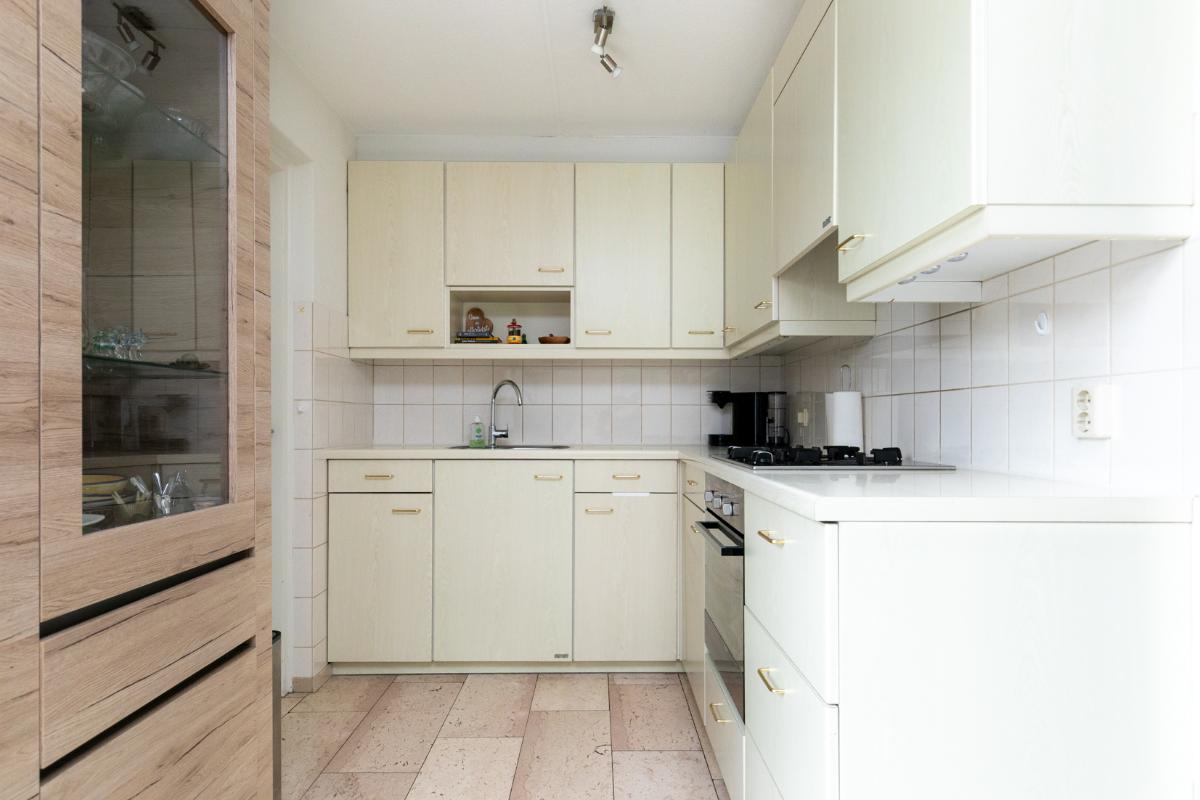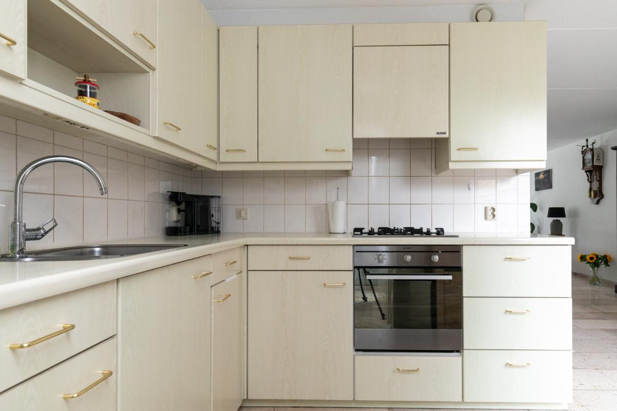 De aangrenzende keuken is netjes en functioneel, en dankzij de praktische indeling eenvoudig te moderniseren naar je eigen smaak. Vanuit de keuken bereik je de bijkeuken, ideaal als wasruimte, voorraadkamer of extra bergruimte. De garage is direct vanuit de bijkeuken bereikbaar: comfortabel en praktisch.