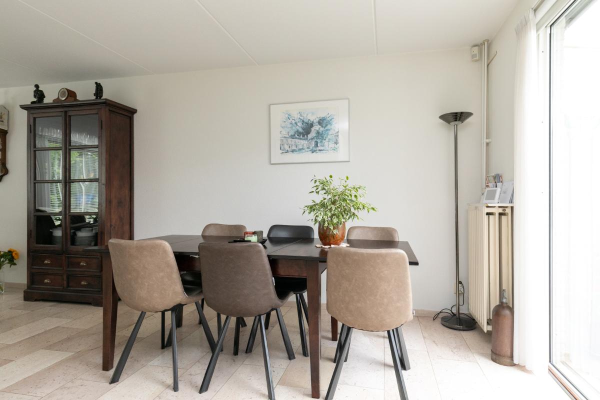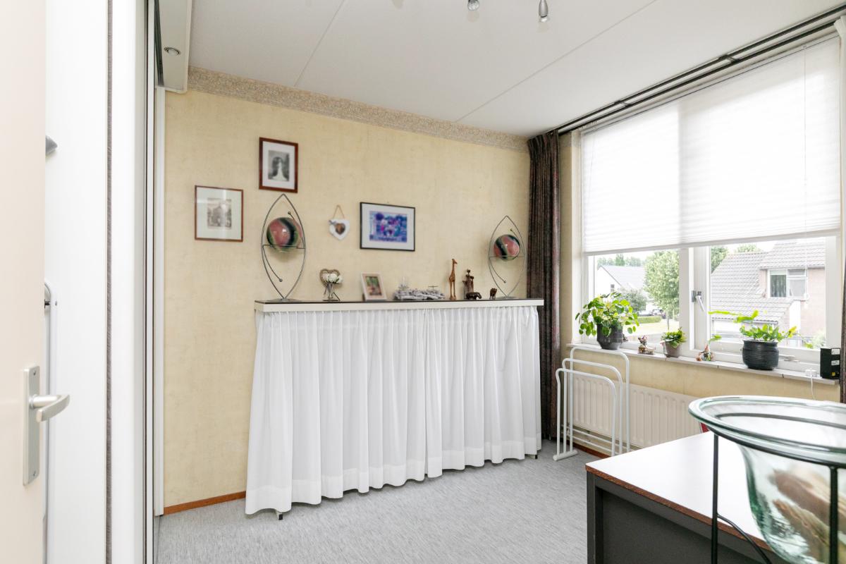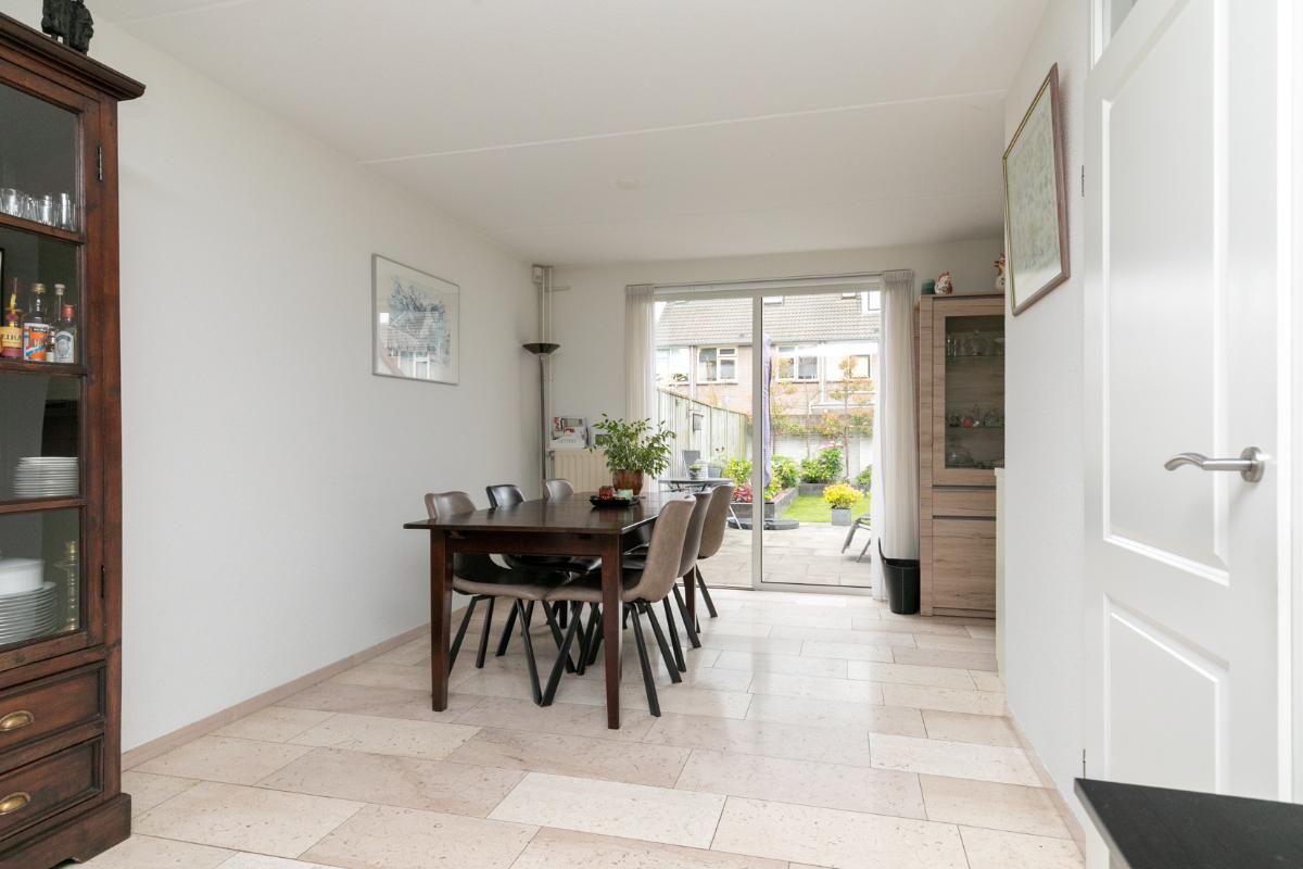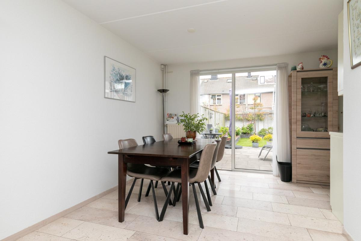 De aangrenzende keuken is netjes en functioneel, en dankzij de praktische indeling eenvoudig te moderniseren naar je eigen smaak. Vanuit de keuken bereik je de bijkeuken, ideaal als wasruimte, voorraadkamer of extra bergruimte. De garage is direct vanuit de bijkeuken bereikbaar: comfortabel en praktisch.