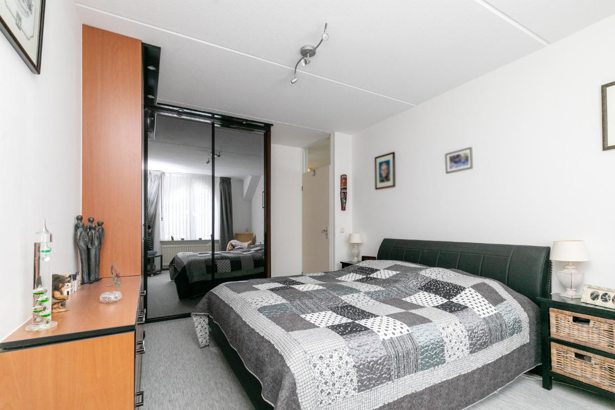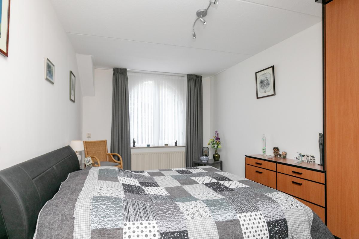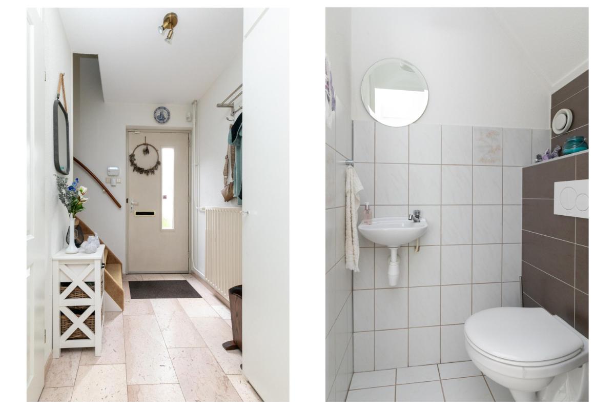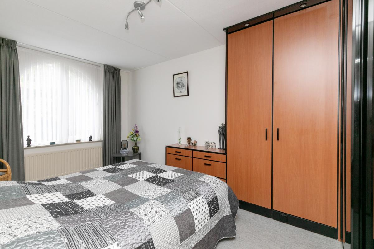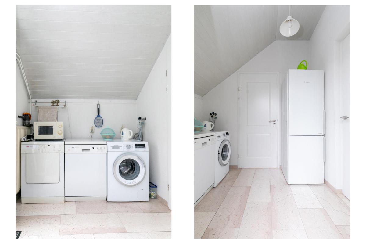 De aangrenzende keuken is netjes en functioneel, en dankzij de praktische indeling eenvoudig te moderniseren naar je eigen smaak. Vanuit de keuken bereik je de bijkeuken, ideaal als wasruimte, voorraadkamer of extra bergruimte. De garage is direct vanuit de bijkeuken bereikbaar: comfortabel en praktisch.