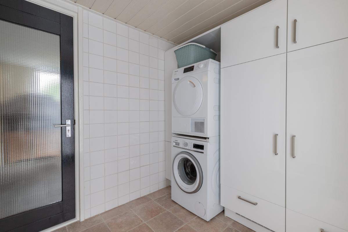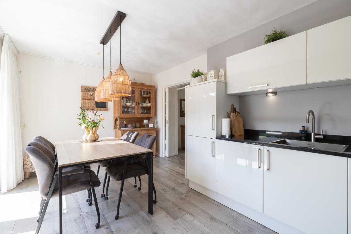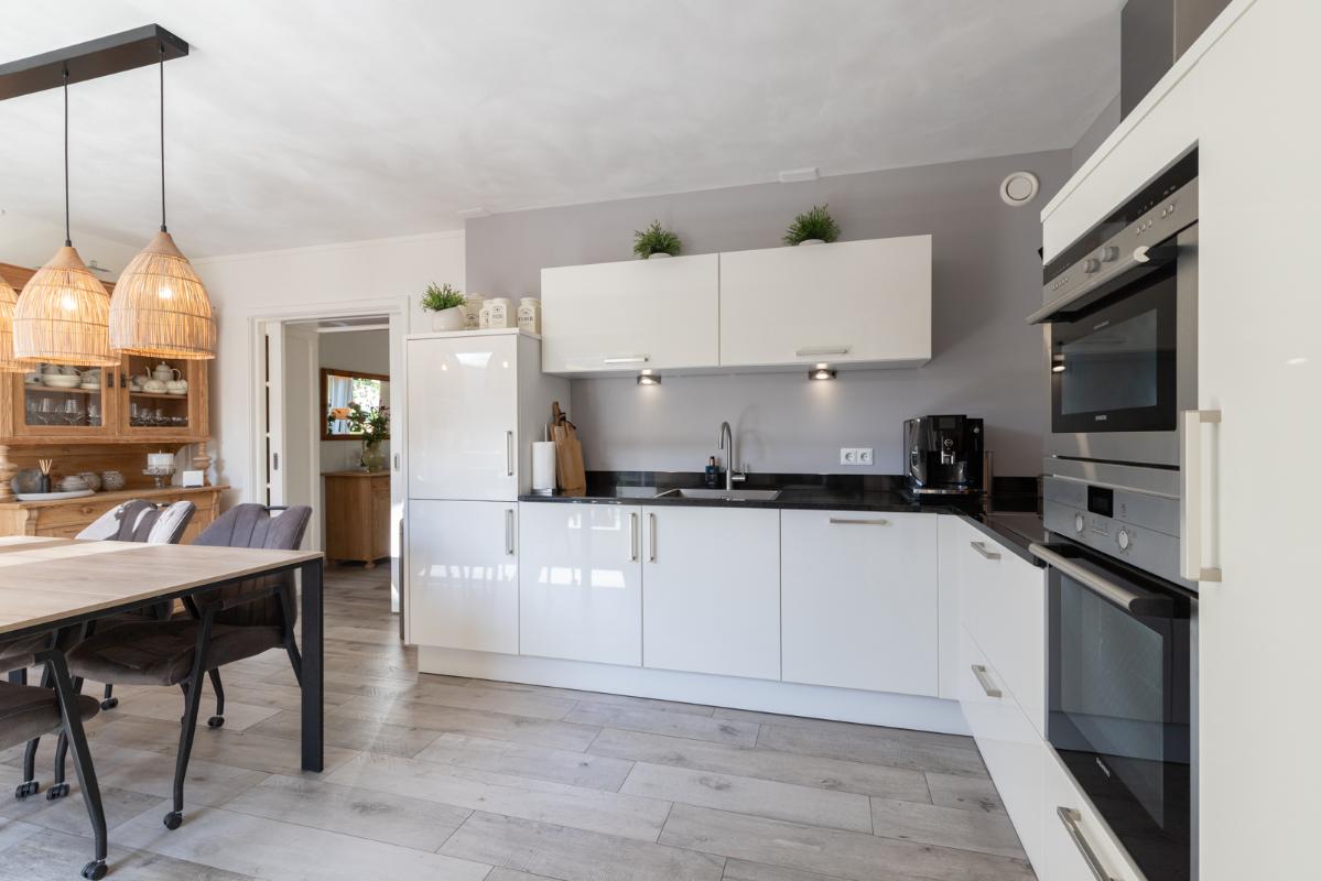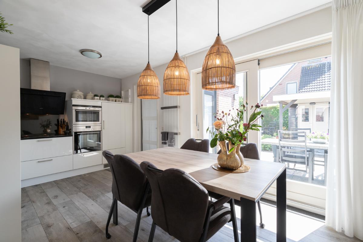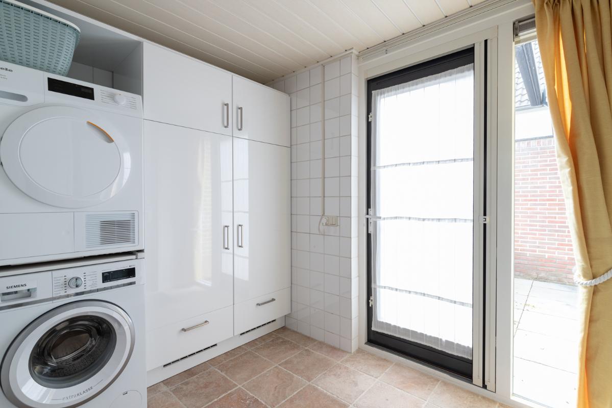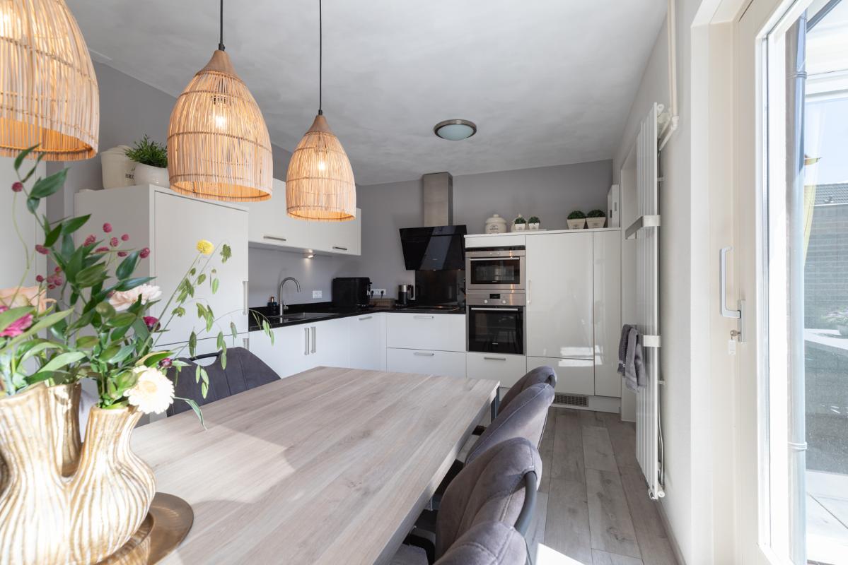 INDELING Begane grond: entree met trapopgang en toilet met hangcloset en hoekfonteintje; L-vormige woonkamer die is voorzien van een fijne zithoek met gashaard. Tussen de keuken en aan de voorzijde gelegen woonkamer, bevinden zich stijlvolle schuifdeuren, omgeven door kastruimte. De hoogglans hoekopgestelde keuken voorziet in diverse inbouwapparatuur, zoals een koelkast, combi-oven, oven, vaatwasser, 4 pits inductiekookplaat met afzuiging én praktische grote spoelbak. Brede laden en bovenkasten, gecombineerd met een granieten blad geven de keuken een moderne look. Vanuit de eethoek biedt de schuifpui (met ingebouwde hor) toegang tot het zonnige terras. Naast de keuken bevindt zich nog een praktische royale bijkeuken, waar zich een keurige kastopstelling bevindt in dezelfde uitvoering als de keuken. Hierin vindt u een extra ladenvriezer, koelkast en tevens handige bergruimte als ook de wasmachineopstelling. Vanuit de bijkeuken is de garage toegankelijk.