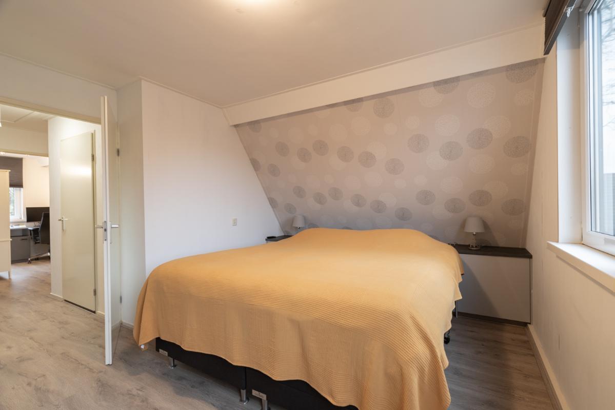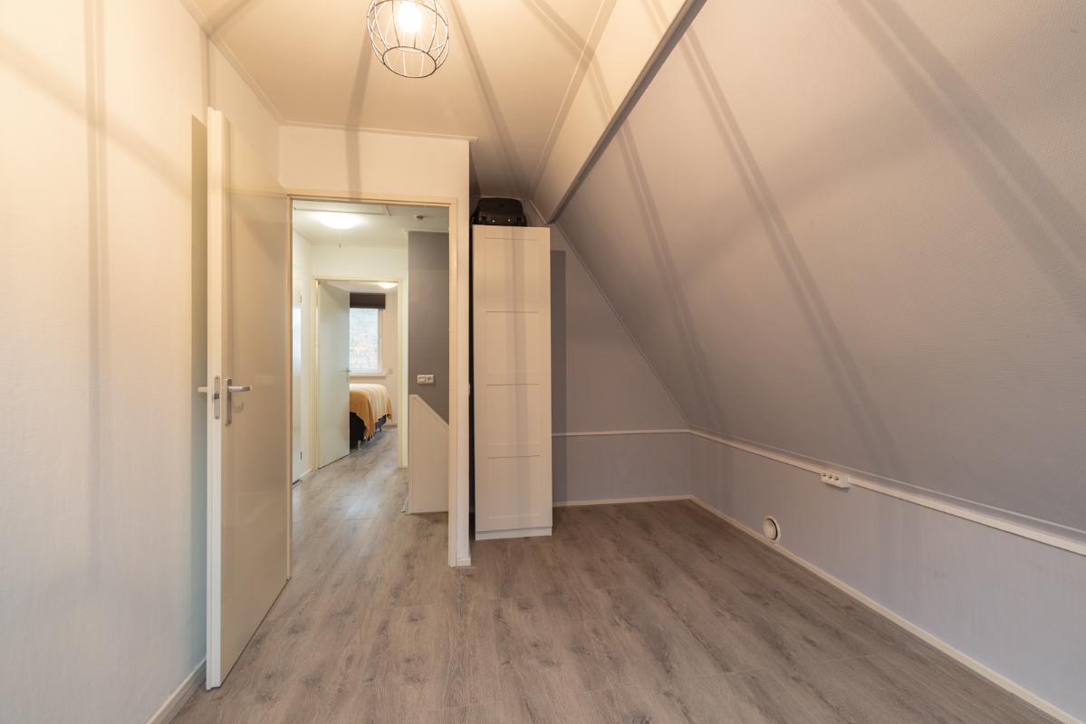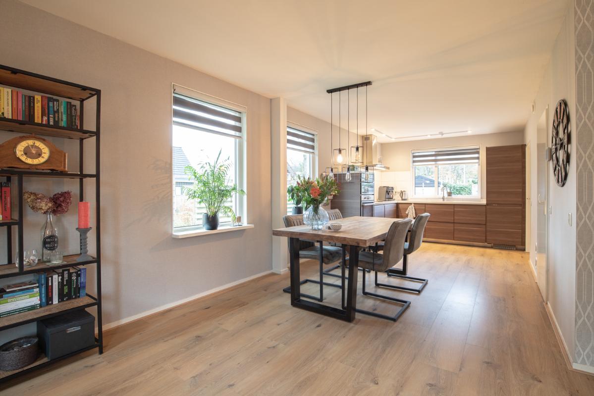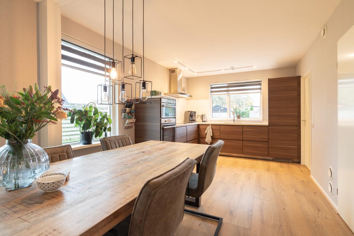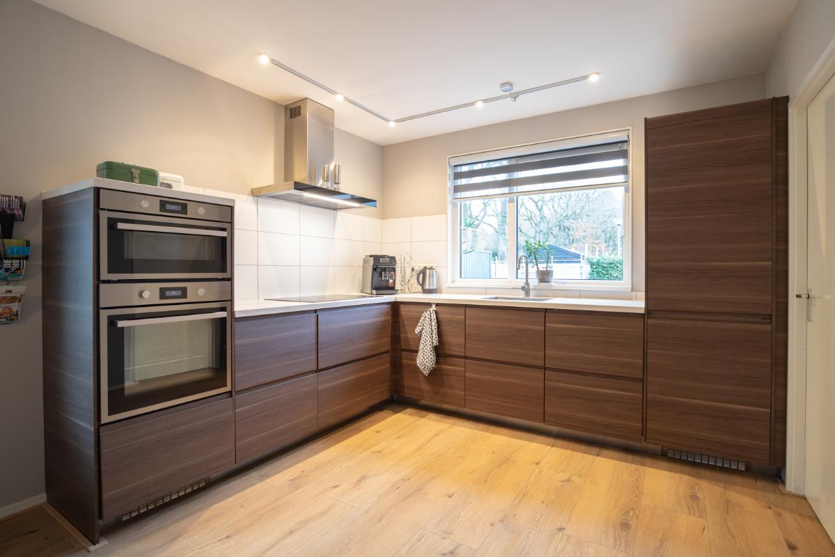 INDELING: Begane grond: entree/hal met toilet (wandcloset met fonteintje); een royale L-vormige woonkamer met open keuken (samen circa 38m²). De moderne keuken is voorzien van een inductie-kookplaat, rvs-afzuigschouw, vaatwasser, koel/vriescombinatie, heteluchtoven en combimagnetron. Direct naast de keuken bevindt zich de bijkeuken met wasmachine-aansluiting. Via de aangebouwde serre (circa 10m²) toegang tot de tuin en binnendoor naar de garage. Eerste verdieping: overloop, drie slaapkamers (circa 15, 10 en 9m² vloeroppervlakte), waarvan de grootste met een vaste kastenwand. De moderne badkamer (met dakkapel) is voorzien van een wastafelmeubel, ruime inloopdouche en wandcloset. Tweede verdieping: via vlizotrap te bereiken bergzolder (met stahoogte!).