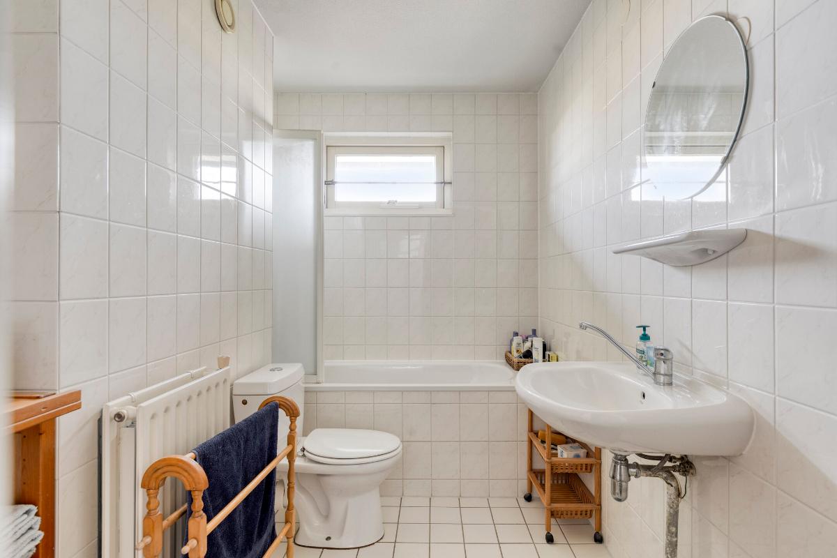 Eerste verdieping: Ruime overloop met toegang tot de drie slaapkamers van respectievelijk ca. 11 m², 13 m² en 15 m². Geheel betegelde badkamer met ligbad, tweede toilet en een wastafel.