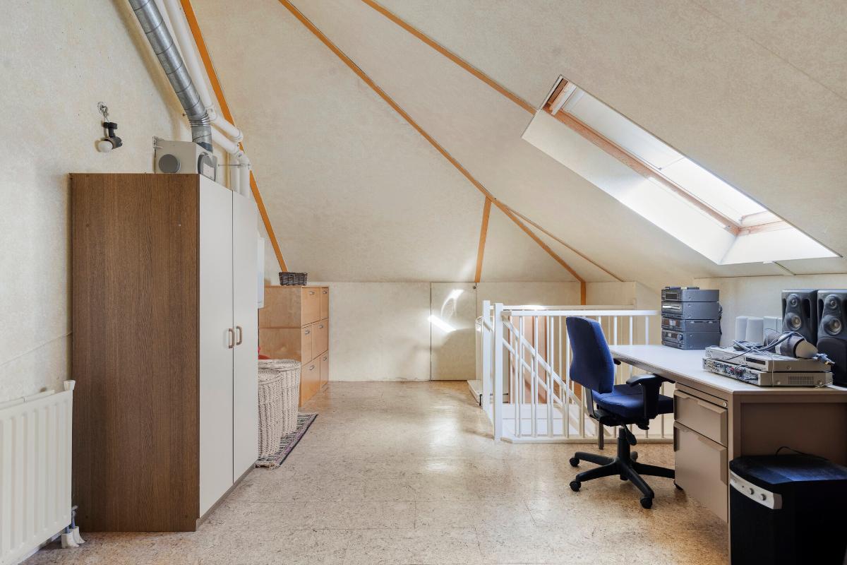 Tweede verdieping: Zolderruimte voorzien van een dakraam, wasmachineaansluiting, knieschotten en de opstelplaats voor de CV-ketel.