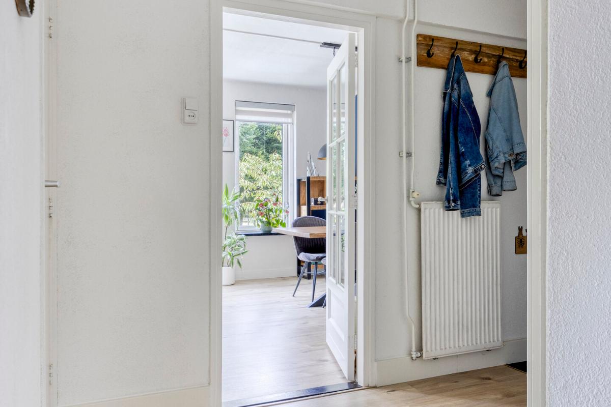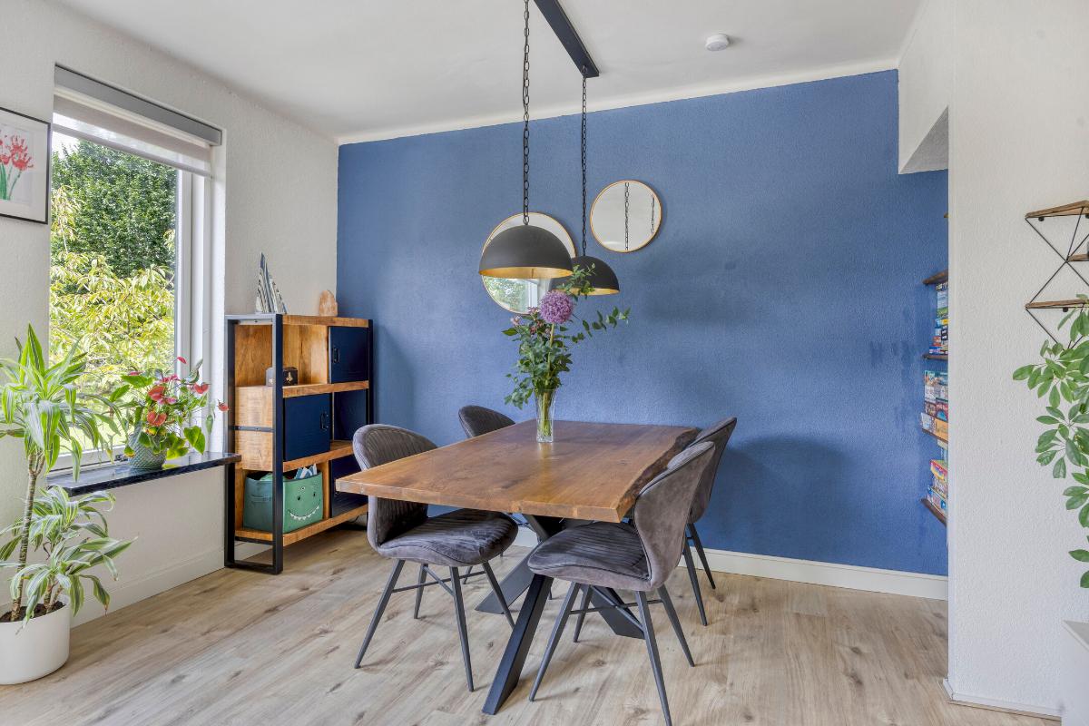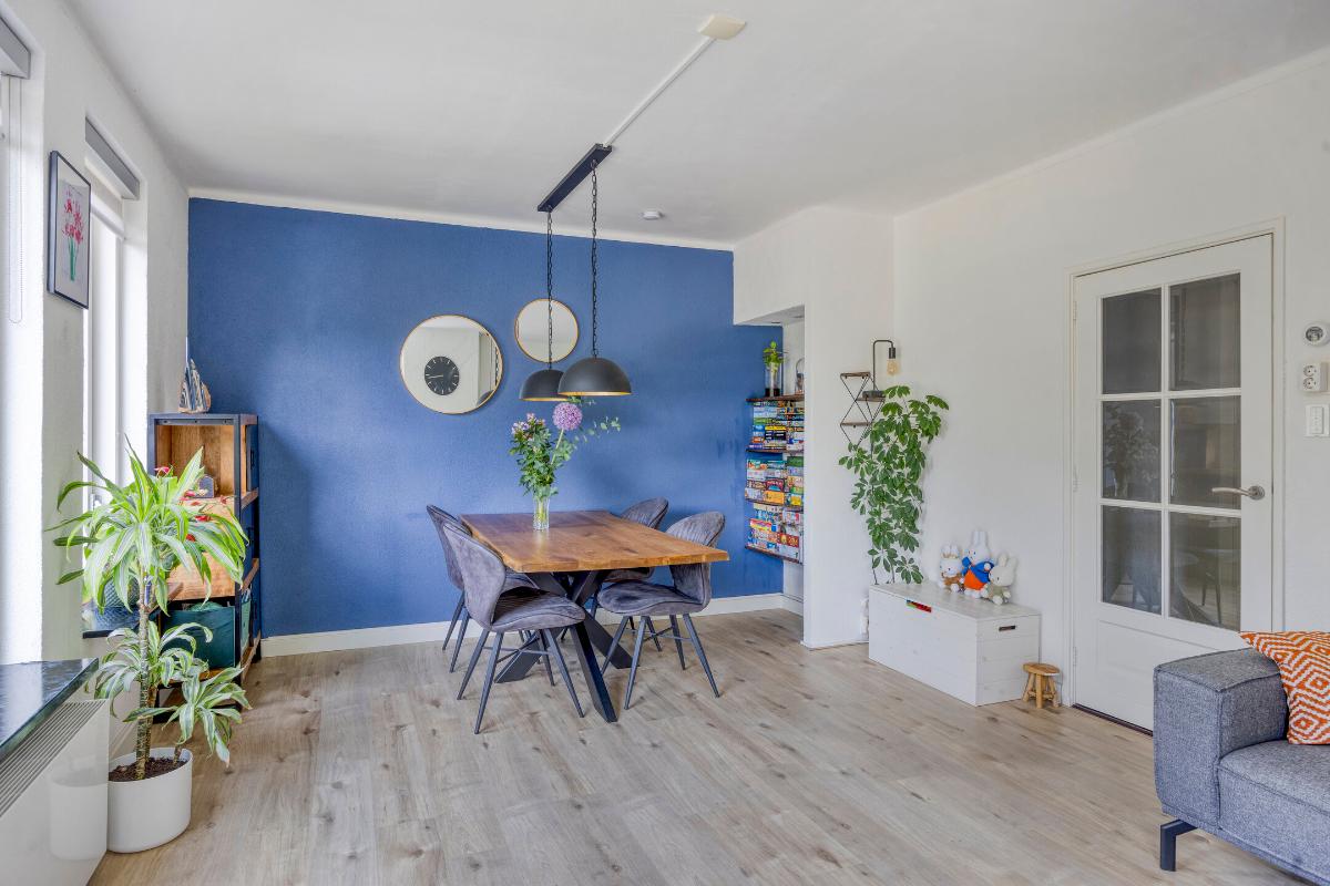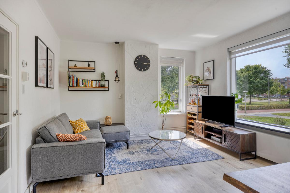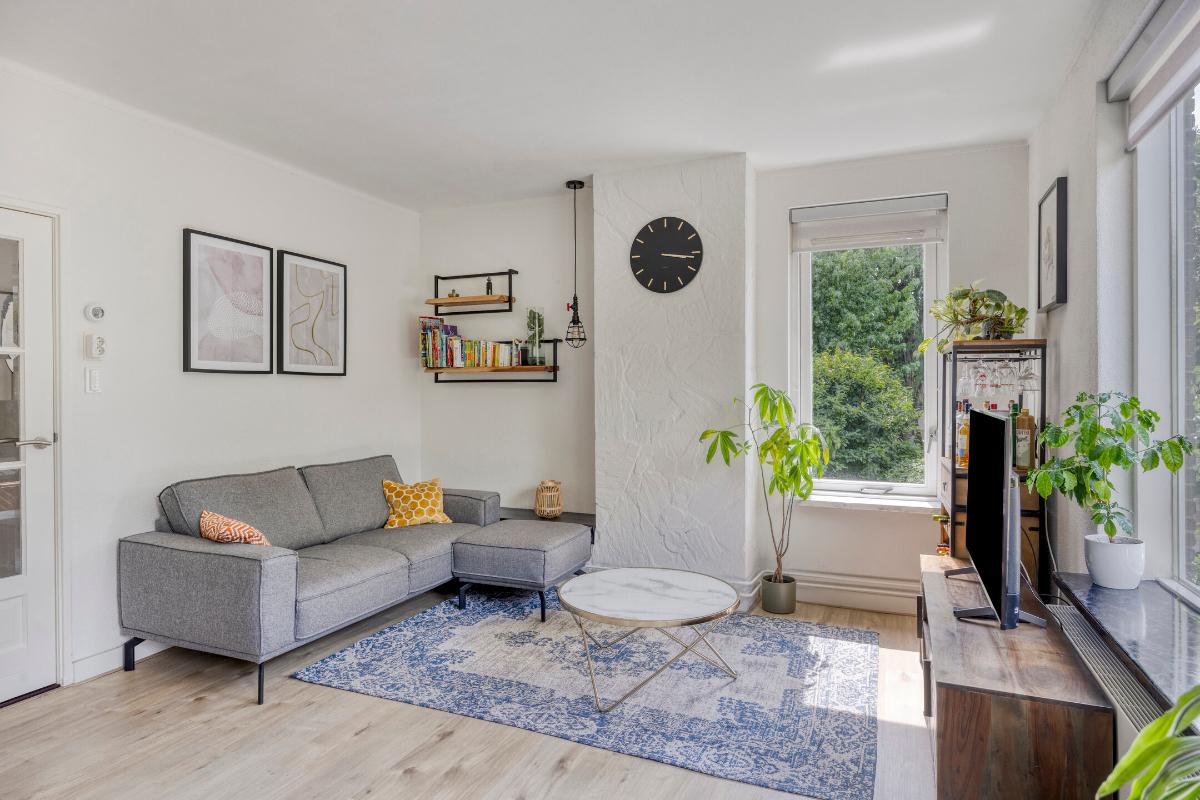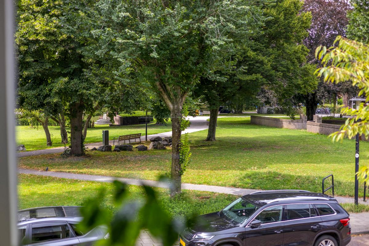 Woonkamer: De lichte, sfeervolle woonkamer kijkt uit over het plantsoen aan de voorzijde. Dankzij de hoekligging valt er extra veel daglicht naar binnen – een fijne plek om te ontspannen of thuis te werken.