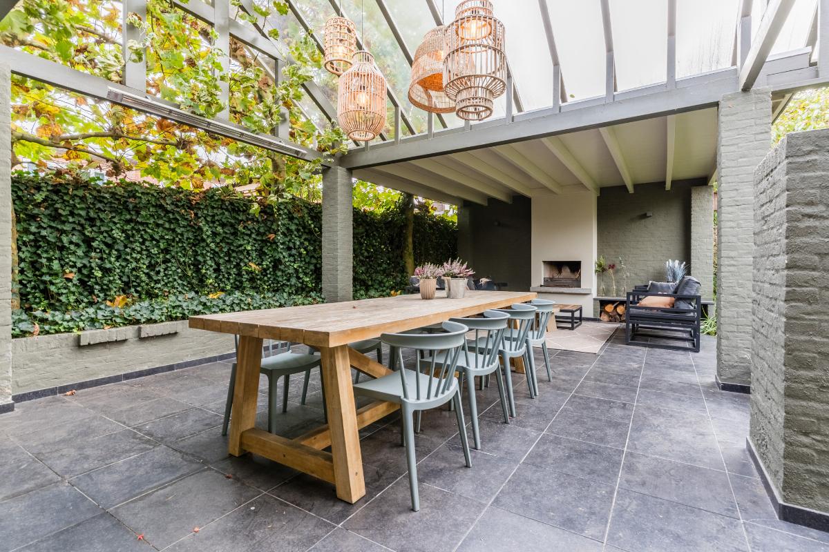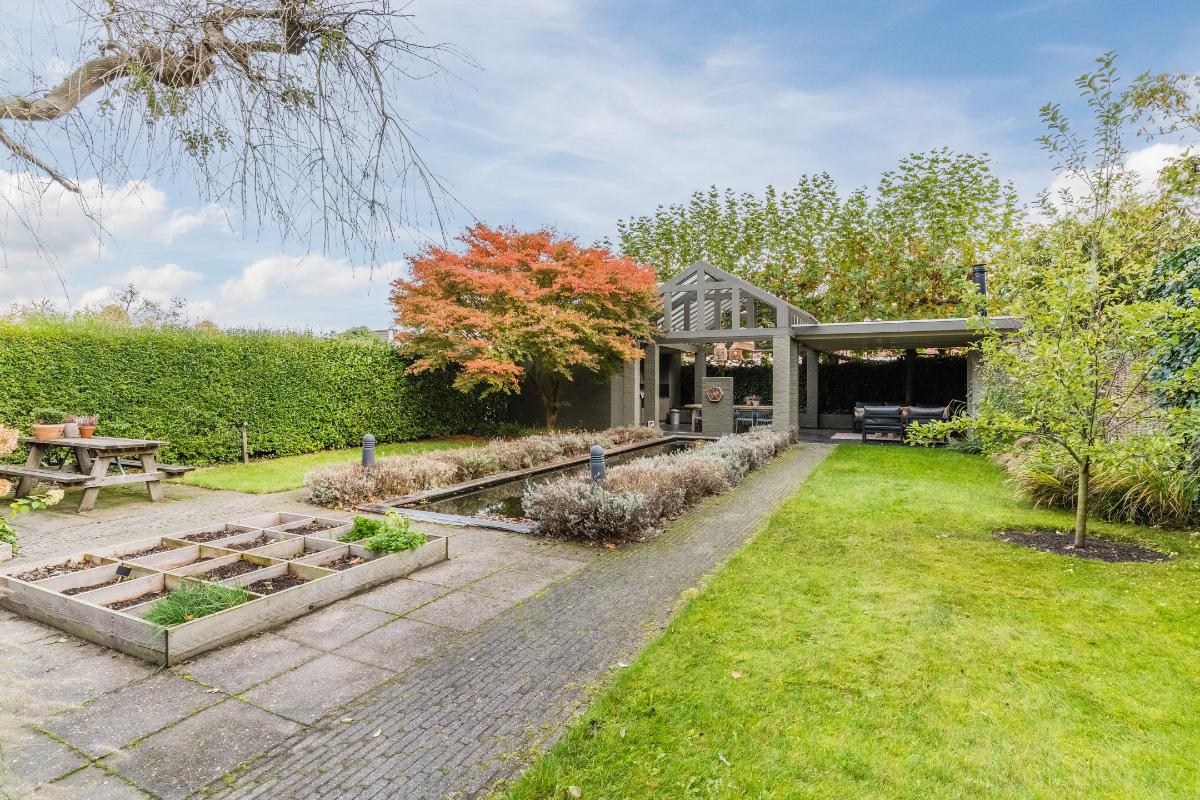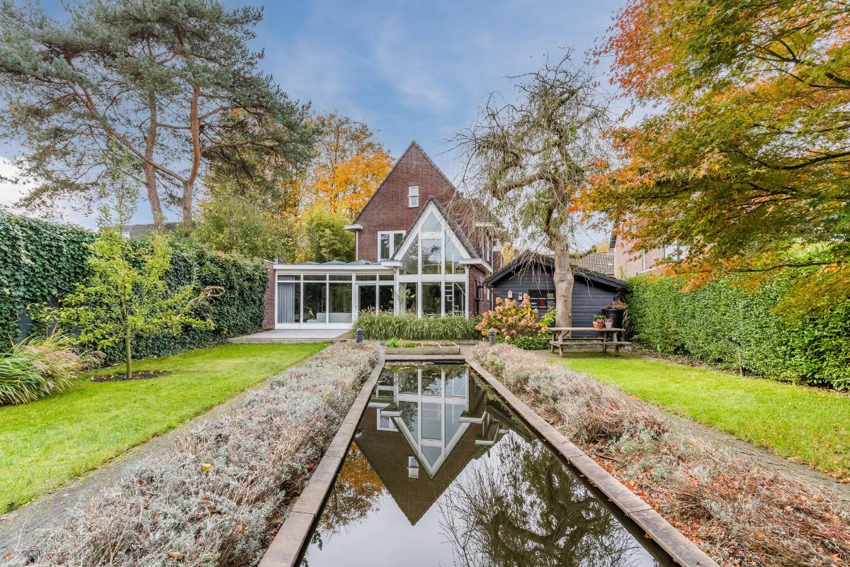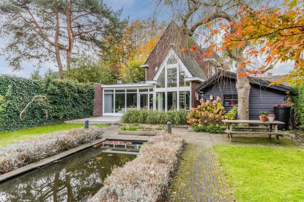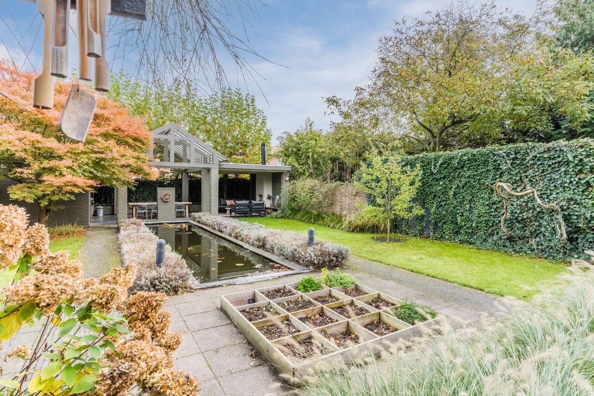 Voortuin met parkeergelegenheid voor meerdere auto's en oplaadpunt. De achtertuin biedt veel privacy en is schitterend aangelegd met onder andere een vijverpartij, gazon en diverse volwassen bomen en beplanting. Achterin bevindt zich een onder architectuur gerealiseerd bijgebouw bestaande uit een terras met buitenkeuken en een multifunctionele ruimte met toilet. Het terras, voorzien van haardpartij is een heerlijke plek om te genieten van het buitenleven tot in de late avond met een fraai uitzicht over de tuin en de markante achtergevel.