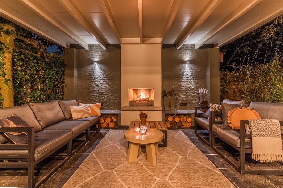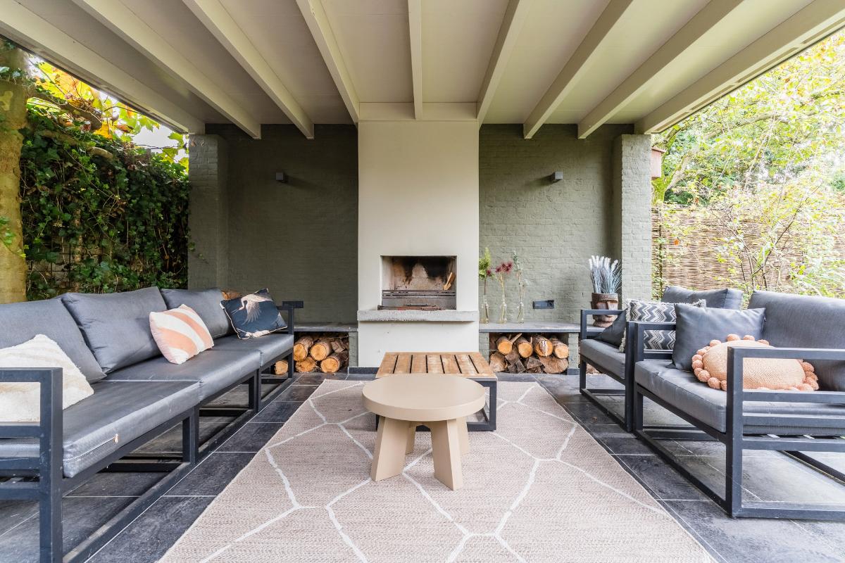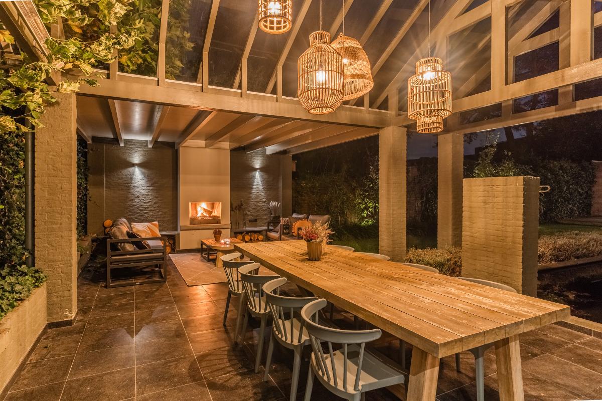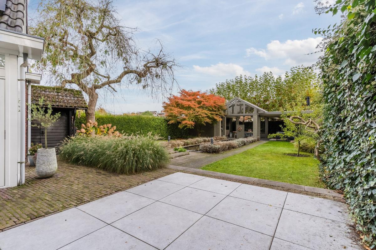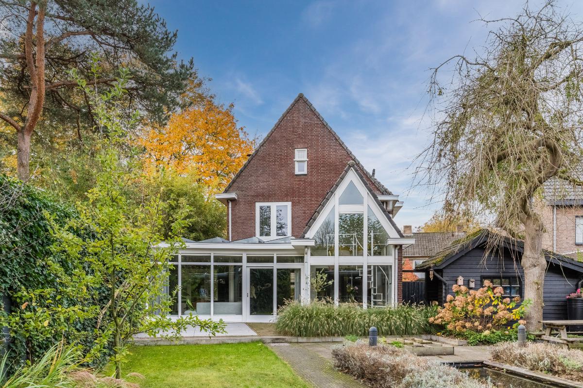 Voortuin met parkeergelegenheid voor meerdere auto's en oplaadpunt. De achtertuin biedt veel privacy en is schitterend aangelegd met onder andere een vijverpartij, gazon en diverse volwassen bomen en beplanting. Achterin bevindt zich een onder architectuur gerealiseerd bijgebouw bestaande uit een terras met buitenkeuken en een multifunctionele ruimte met toilet. Het terras, voorzien van haardpartij is een heerlijke plek om te genieten van het buitenleven tot in de late avond met een fraai uitzicht over de tuin en de markante achtergevel.
