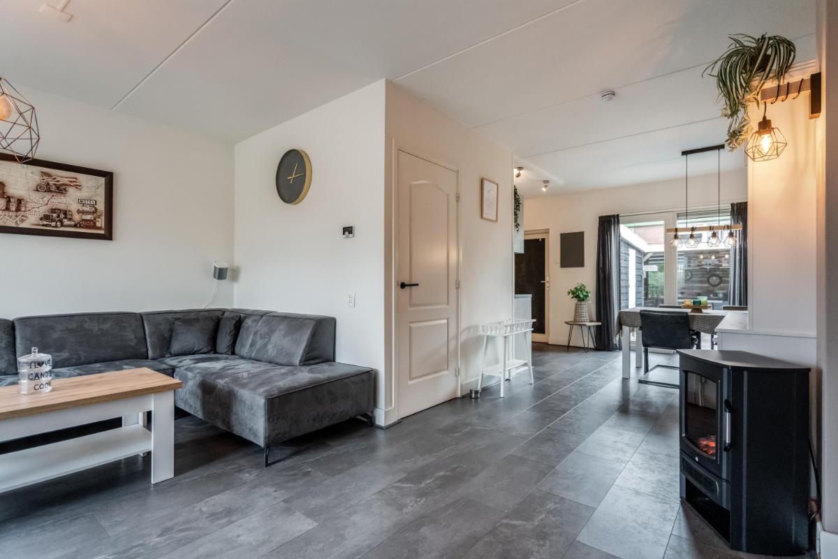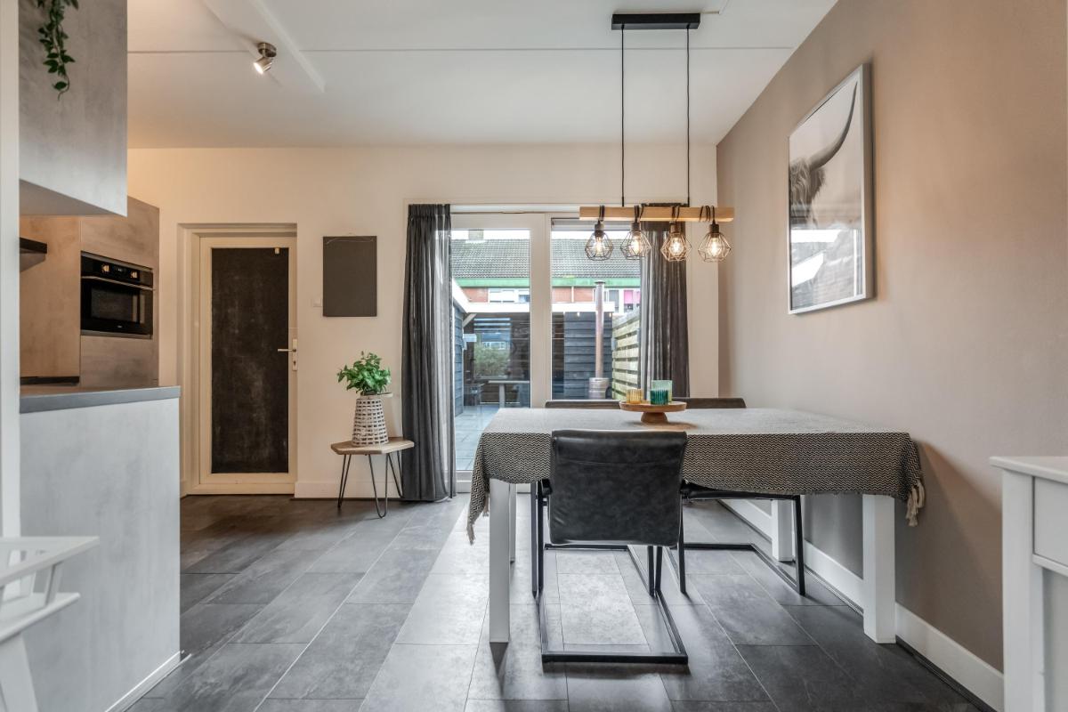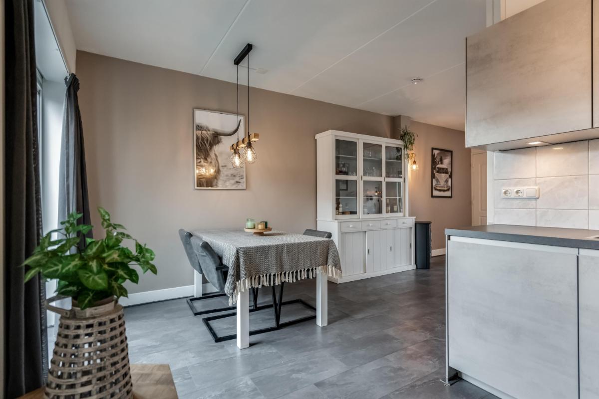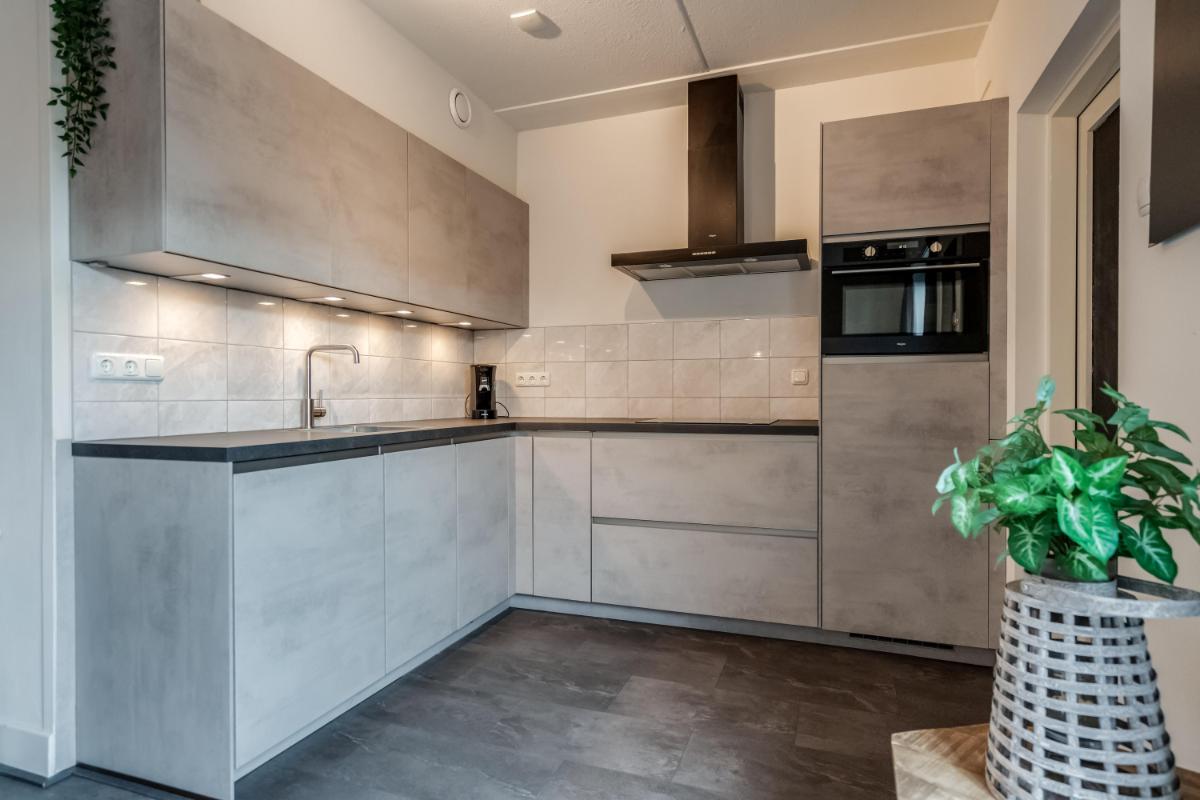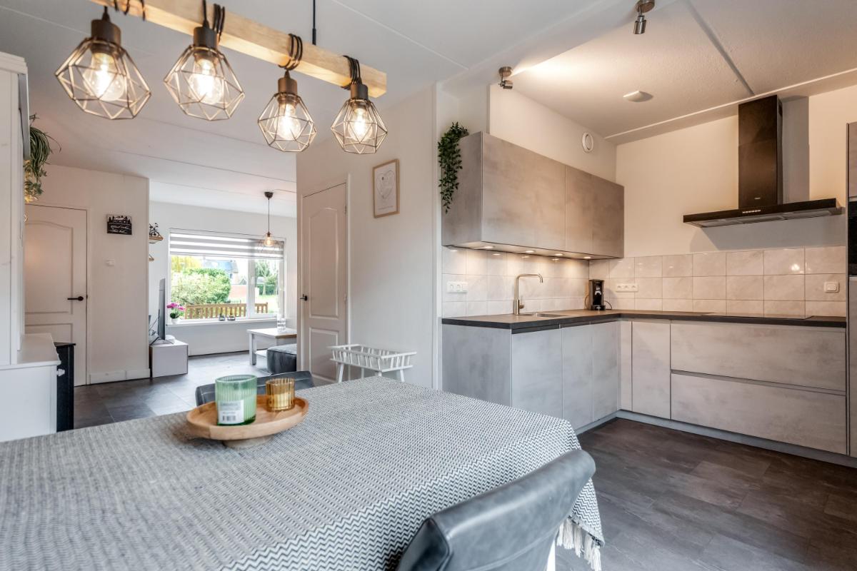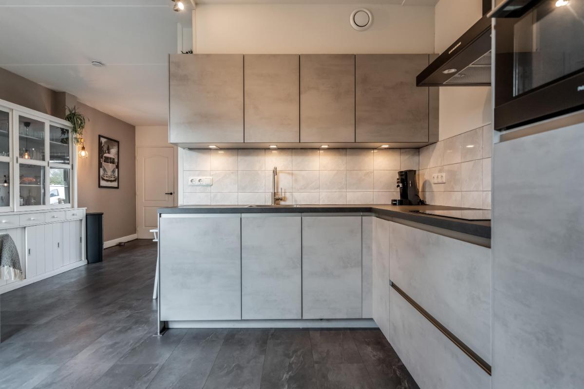 De open keuken aan de achterzijde is in 2021 geplaatst. Hier kook je met plezier dankzij de ingebouwde apparatuur en de slimme indeling. Alles is netjes, licht en goed onderhouden. Vanuit de keuken stap je via de achterdeur naar buiten.
