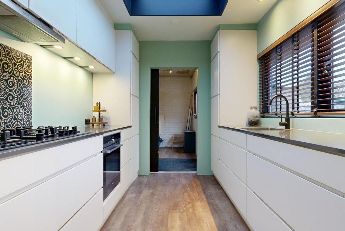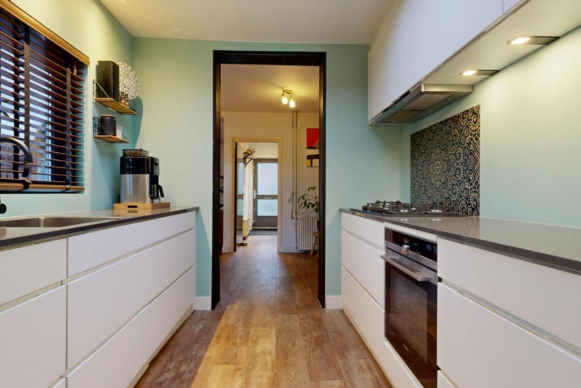 Op de begane grond kom je binnen via de entree met toegang tot het moderne toilet (2020), de meterkast en de verdiepte trapkast. De lichte woonkamer heeft strak gestukadoorde plafonds en grote ramen, waardoor het daglicht rijkelijk binnenvalt. Aan de achterzijde vind je de moderne keuken met lichtkoepel, voorzien van een composiet werkblad, oven, vaatwasser, gasfornuis, grote koelkast en vriezer. Via de keuken bereik je de praktische berging met cv-ketel en aansluitingen voor witgoed.