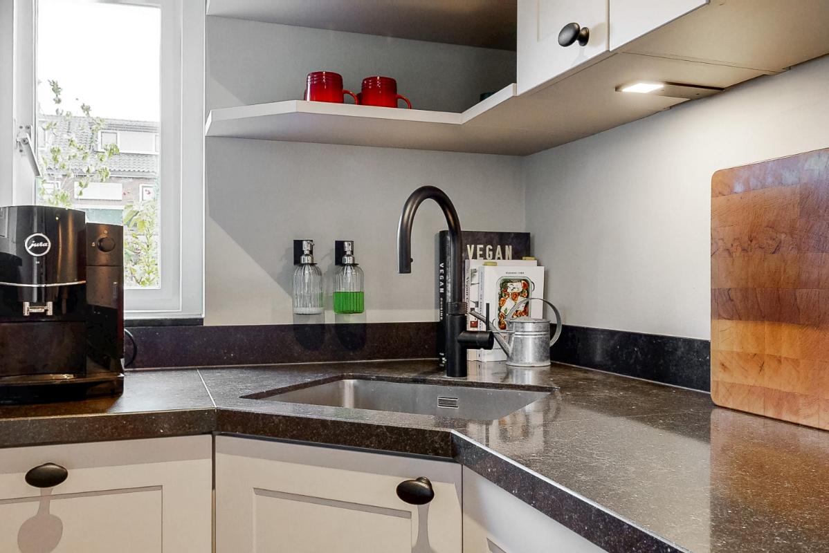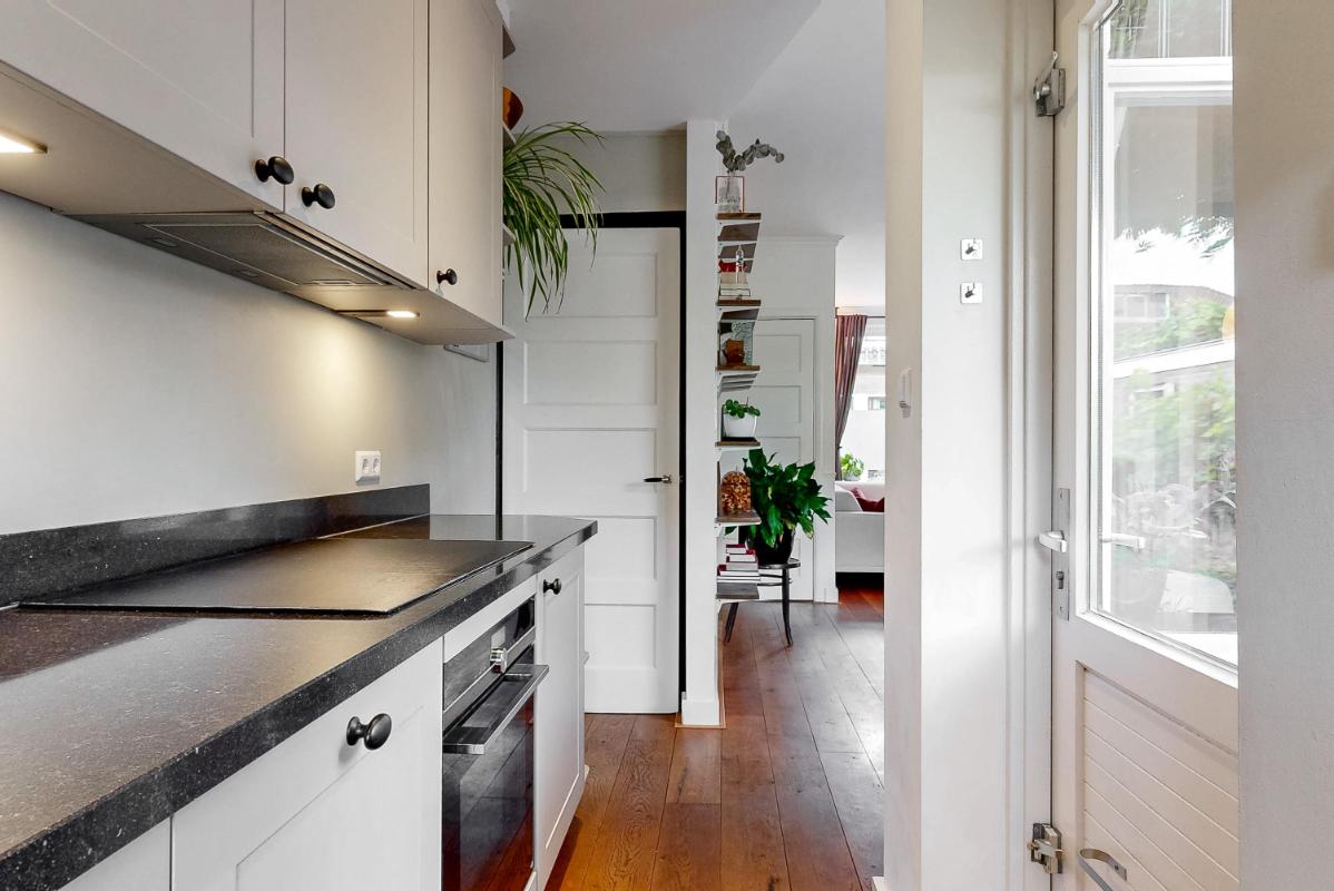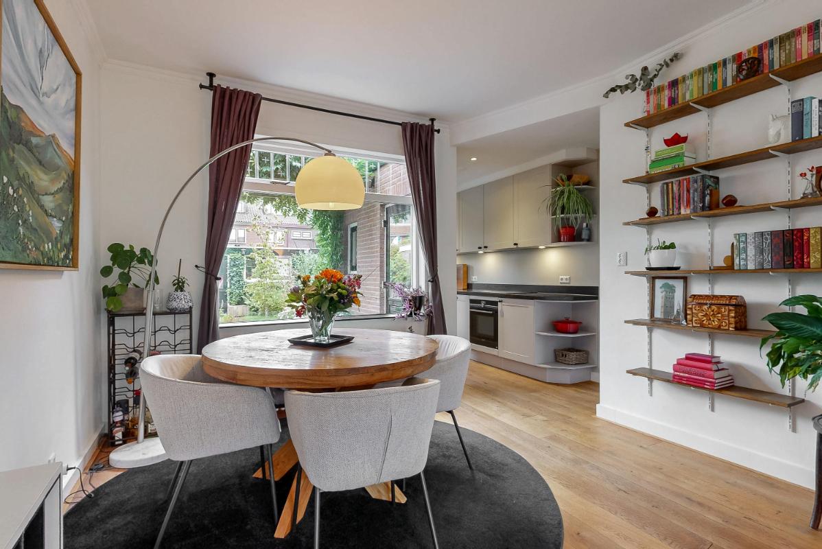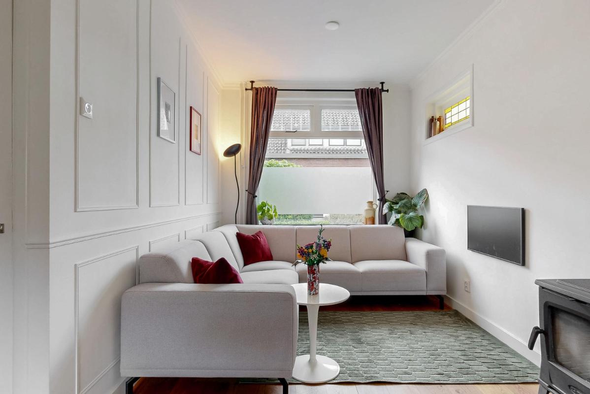 Bij binnenkomst tref je de hal met toilet, trapkast en de in 2020 vernieuwde meterkast. De lichte woonkamer aan de voorzijde straalt sfeer uit, mede dankzij de houtkachel, de eikenhouten vloer en de glas-in-lood ramen. Aan de achterzijde is de open designkeuken gelegen, compleet uitgerust met Siemens apparatuur. De keuken is voorzien van een 5-pits inductiekookplaat met afzuigkap, combi-oven, vaatwasser, koelkast en Quooker.