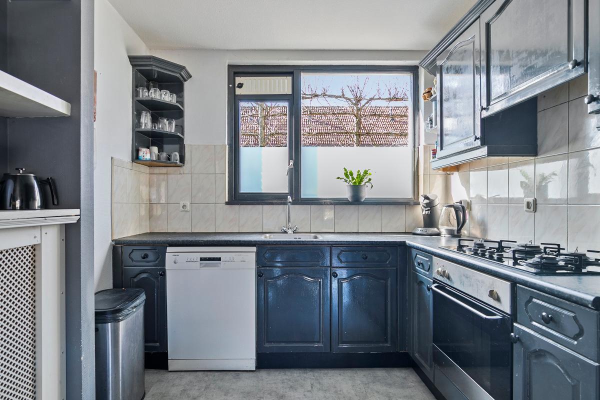 Indeling Begane grond U betreedt de woning via de entree met hal voorzien van toiletruimte met toilet en fonteintje, meterkast, trapopgang naar 1e verdieping en toegangsdeur naar de woonkamer en keuken. De woonkamer is gelegen aan de achterzijde en voorzien van een grote raampartij en de toegangsdeur naar de diepe achtertuin. De landelijke open keuken aan de voorzijde met diverse onder- en bovenkasten in donkere kleurtinten is voorzien van een gasfornuis, oven, koelkast, vriezer en vaatwasser. De begane grond is voorzien van een lichtgrijze laminaatvloer.