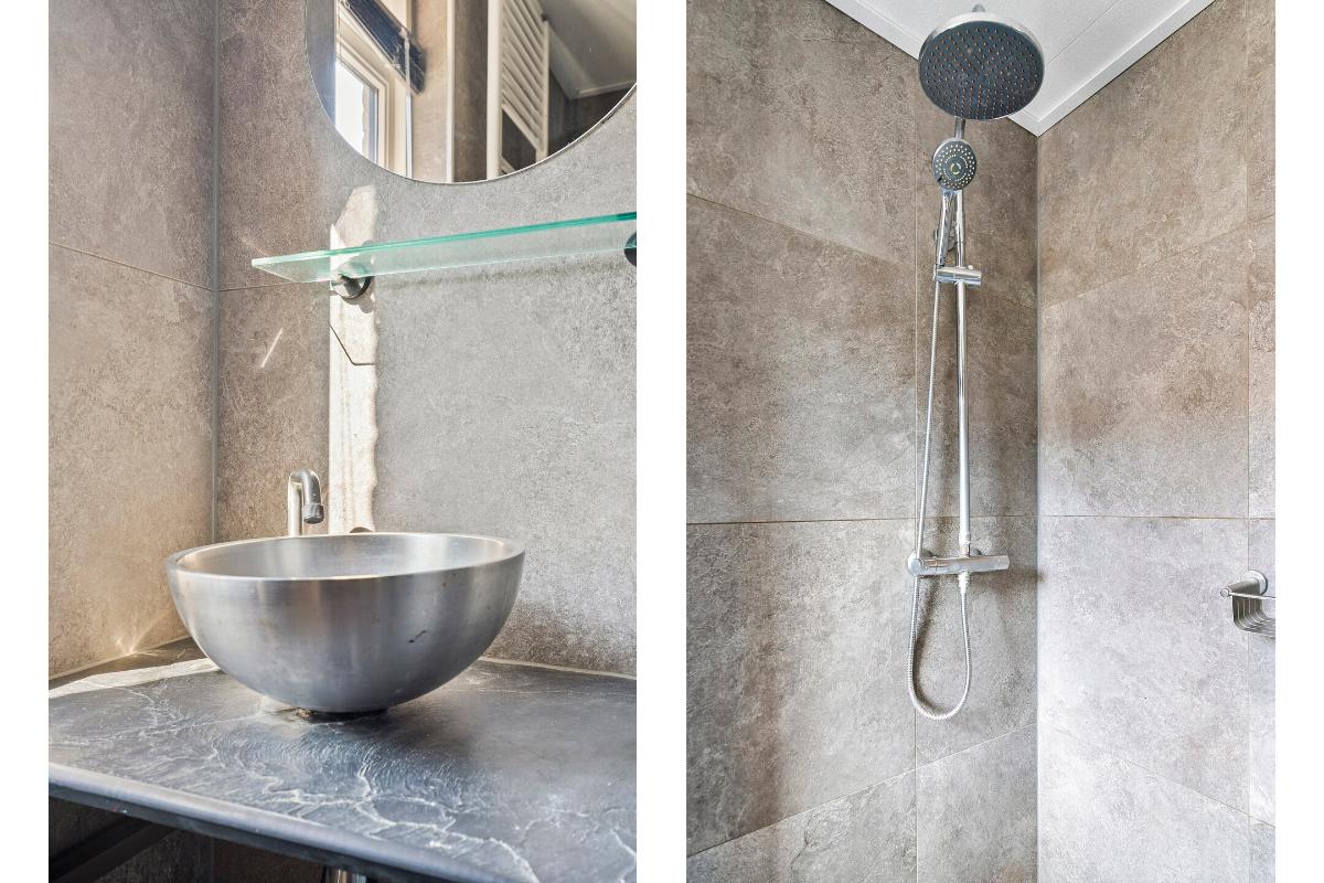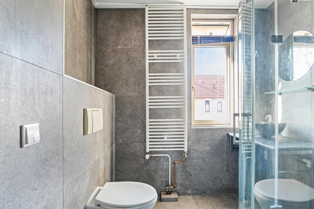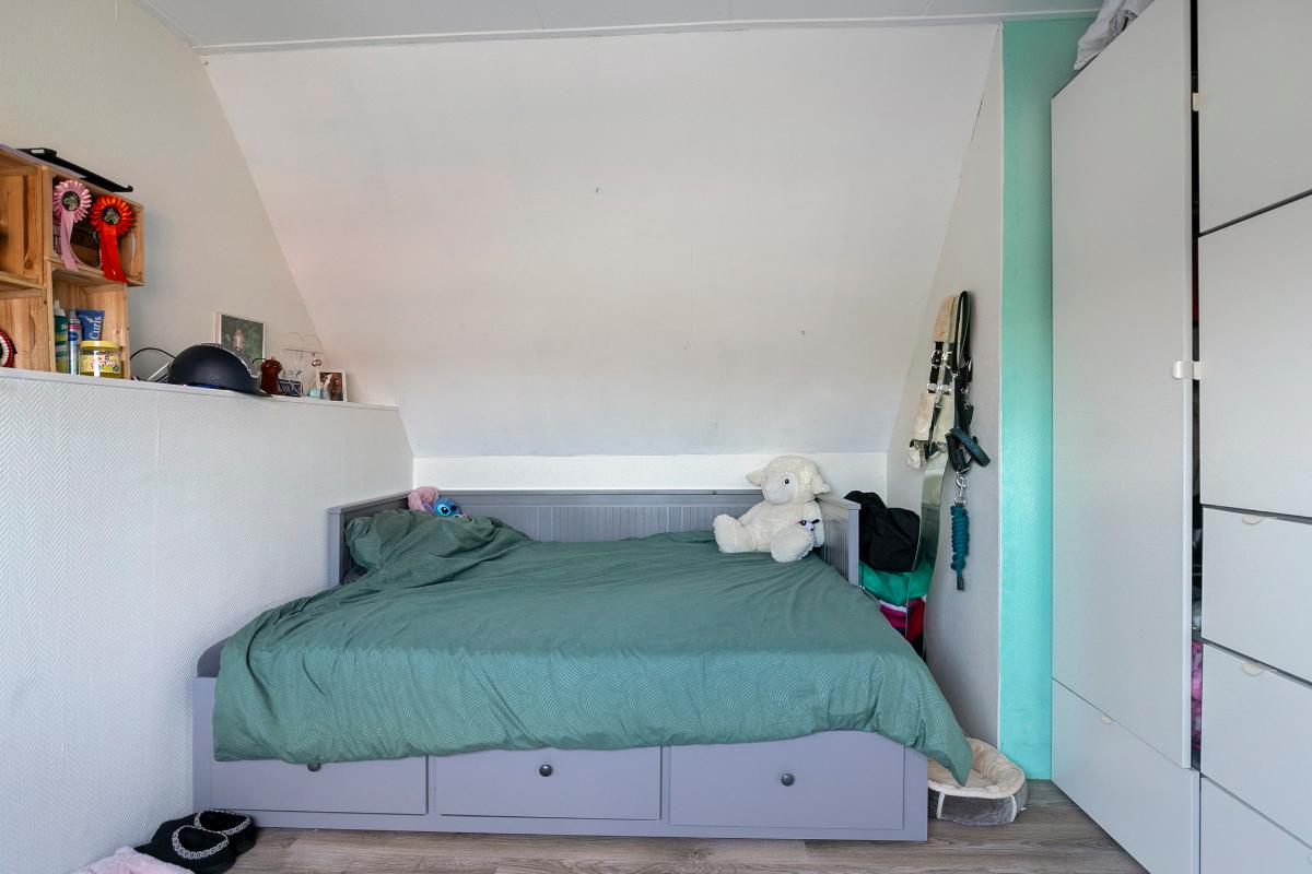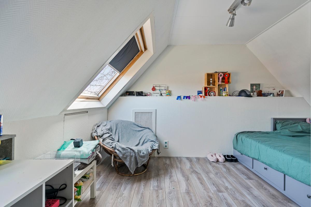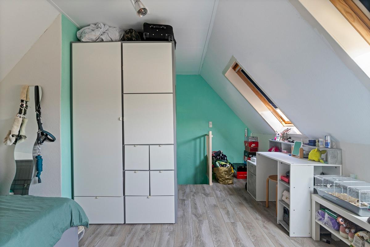 Eerste verdieping Aan de overloop op deze verdieping grenzen een viertal vertrekken, te weten; 3 slaapkamers en een badkamer. Aan de achterzijde liggen de grootste en kleinere slaapkamers welke voorzien zijn van grote dakramen, vloerbedekking en veel ruimte achter de knieschotten. De 3e slaapkamer is gelegen aan de voorzijde, evenals de badkamer, hier ligt een vinylvloer. De volledig betegelde badkamer is voorzien van een douchecabine, wastafelmeubel met waskom, 2e toilet en radiator.