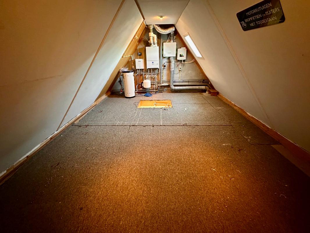 2e verdieping De 2e verdieping is bereikbaar via een vlizotrap. Hier bevindt zich de installatie van de Cv-ketel, het hybride warmtepompsysteem, de mechanische ventilatie en de omvormer van de zonnepanelen De openruimte is voorzien van een Velux-dakraam. Met het plaatsen van een vaste trap heeft u de mogelijkheid om hier een extra kamer te creëren. Deze gehele verdieping is voorzien van vloerbedekking.