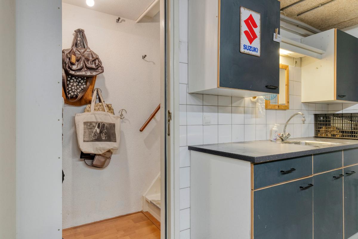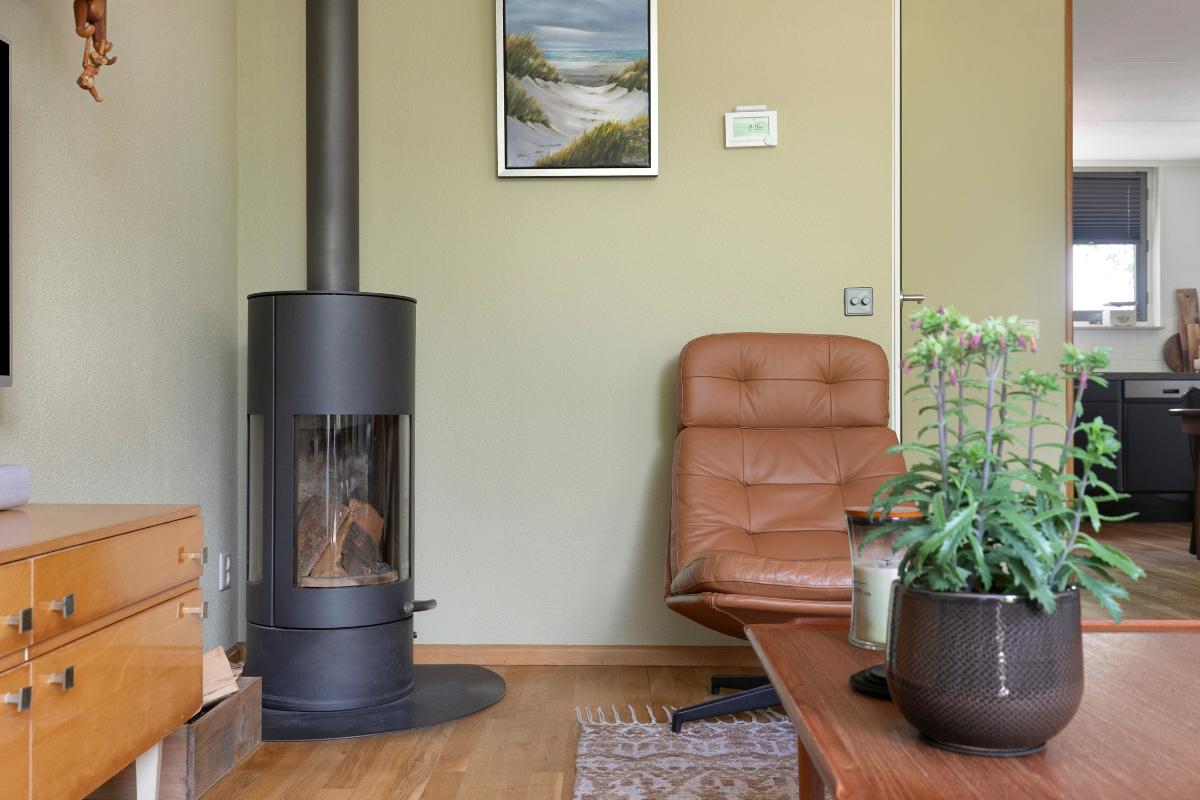 Begane grond: Bij binnenkomst treft u de entree, trapopgang naar de 1e verdieping en de deur naar het souterrain, moderne toiletruimte met wandcloset en fonteintje, meterkast en toegangsdeur naar de woonkamer/keuken. De ruime en lichte open keuken is gelegen aan de voorzijde. De praktische lichte keuken is voorzien van de benodigde inbouwapparatuur (4-pits gaskookplaat, magnetron, vaatwasser en koelkast). Een mooie grote eethoek kunt u hier prima kwijt. De tuingerichte woonkamer met deur naar de achtertuin is voorzien van een houtkachel. De begane grond is voorzien van een eikenhouten parketvloer, de wanden en plafonds voorzien van spachtelputz.