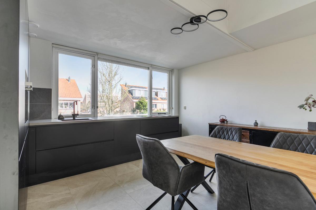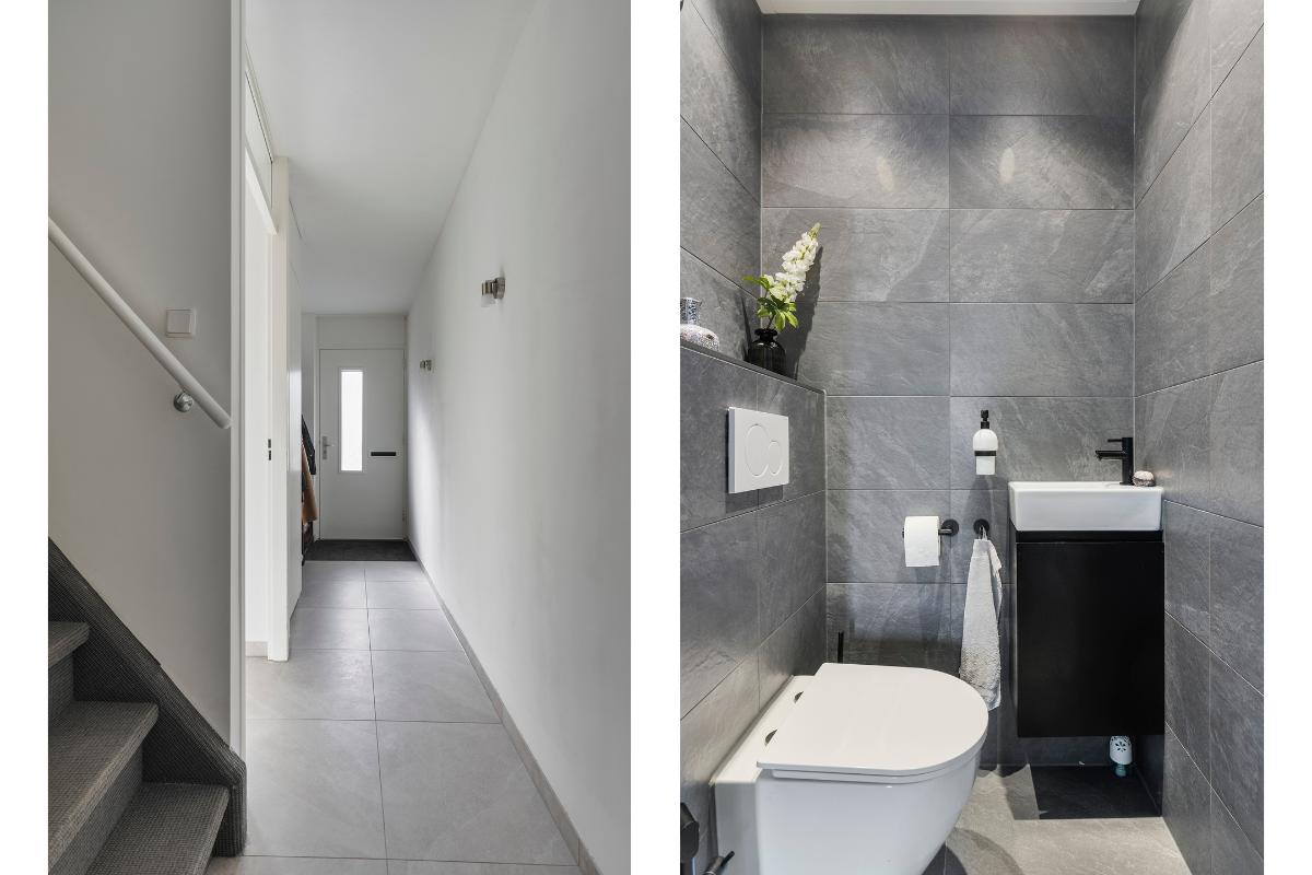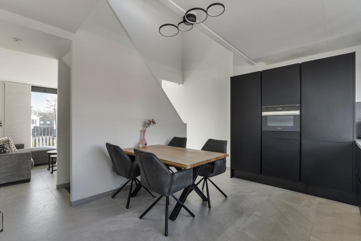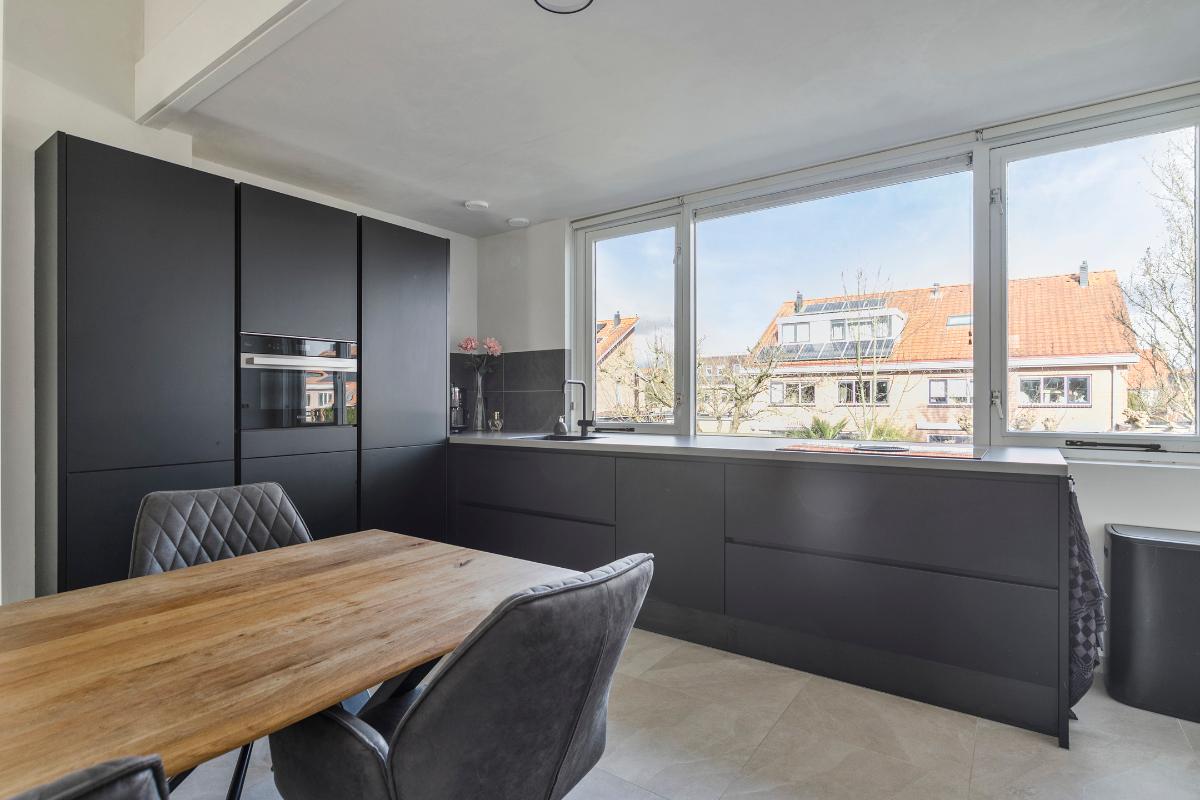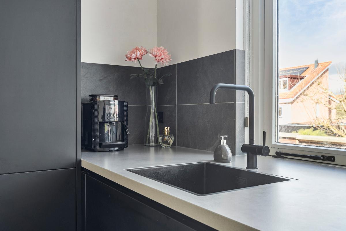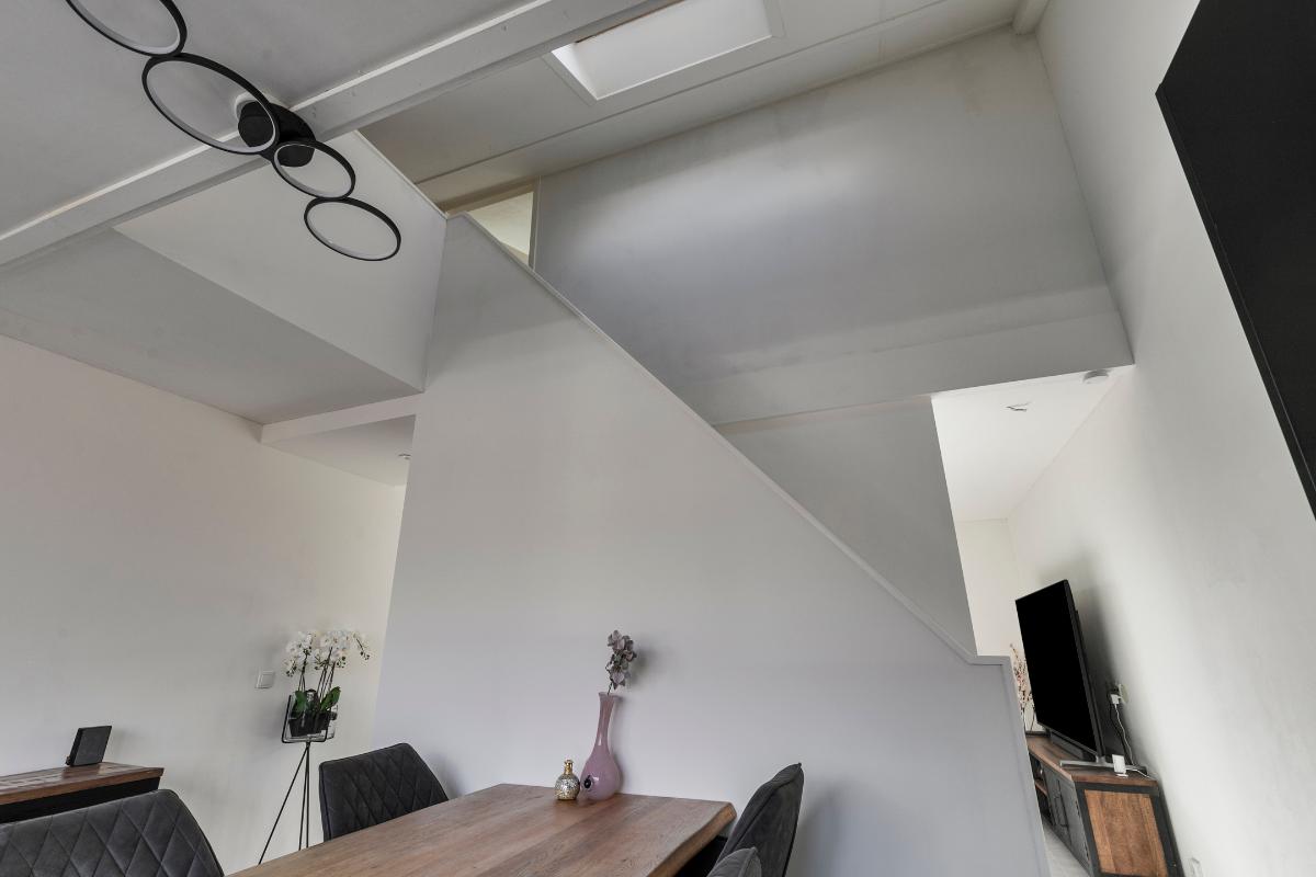 1e Verdieping De royale woonkamer aan de voorzijde heeft vrij uitzicht, schuifpui en een Frans balkon en beidt aan 2 zijden doorgang naar de royale open woonkeuken. Deze is met een mat zwarte L-vormige opstelling en een licht composiet aanrechtblad met zwarte spoelbak en de benodigde inbouwapparatuur;(combimagnetron, koel-vriescombinatie, vaatwasser en een inductie kookplaat met geïntrigeerde afzuigunit een compleet plaatje. De open trap naar de 2e verdieping, die als divider tussen woonkamer en keuken werkt, maakt het een mooi geheel. Ook deze verdieping is voorzien van een tegelvloer met vloerverwarming.