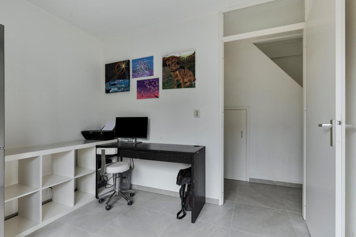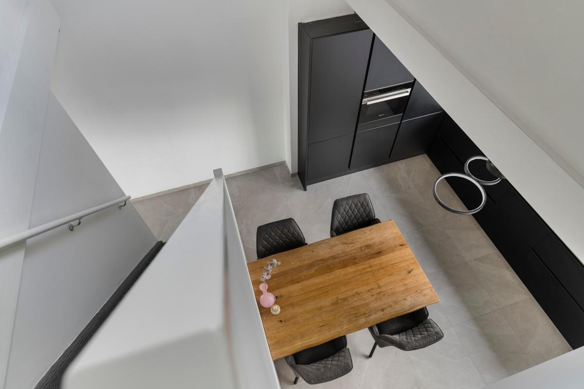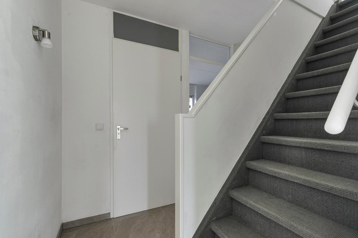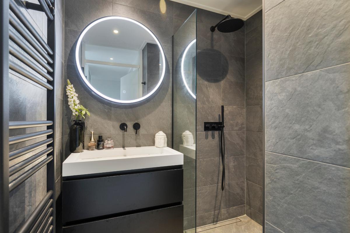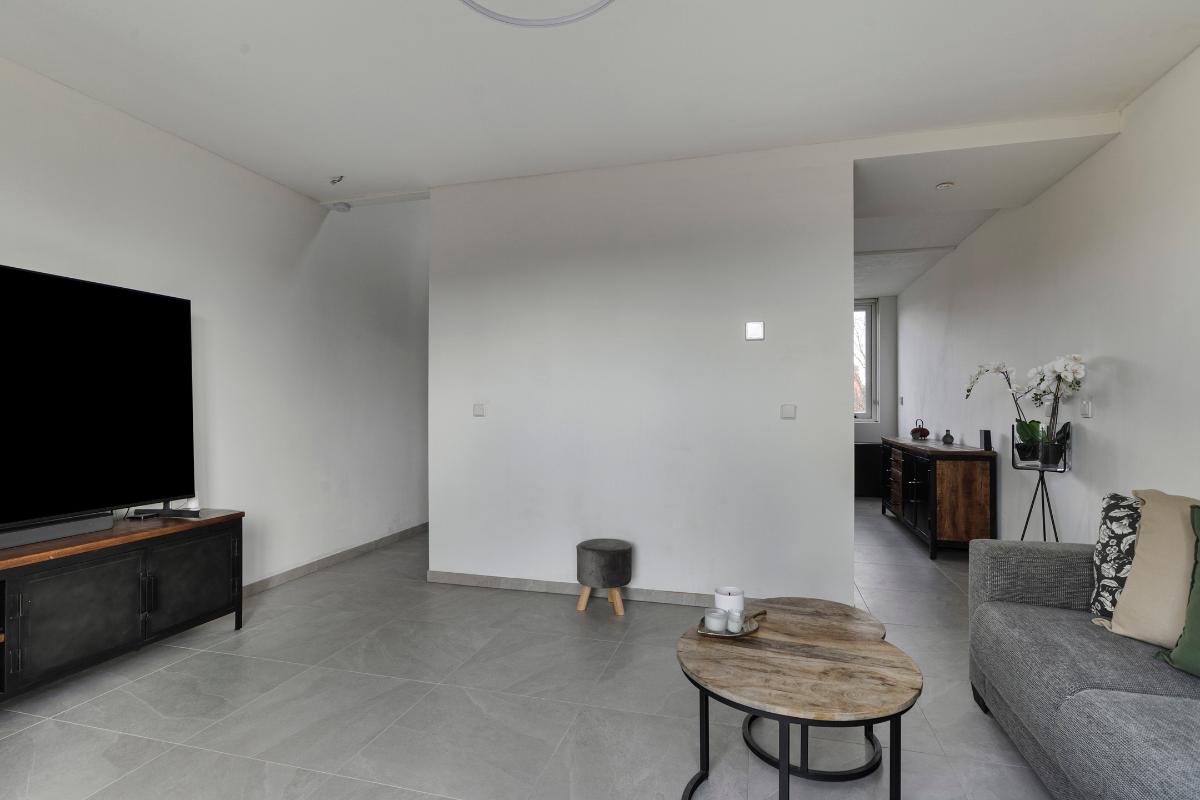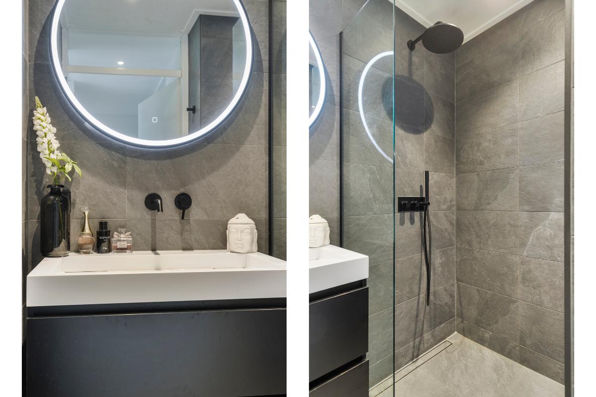1e Verdieping De royale woonkamer aan de voorzijde heeft vrij uitzicht, schuifpui en een Frans balkon en beidt aan 2 zijden doorgang naar de royale open woonkeuken. Deze is met een mat zwarte L-vormige opstelling en een licht composiet aanrechtblad met zwarte spoelbak en de benodigde inbouwapparatuur;(combimagnetron, koel-vriescombinatie, vaatwasser en een inductie kookplaat met geïntrigeerde afzuigunit een compleet plaatje. De open trap naar de 2e verdieping, die als divider tussen woonkamer en keuken werkt, maakt het een mooi geheel. Ook deze verdieping is voorzien van een tegelvloer met vloerverwarming.